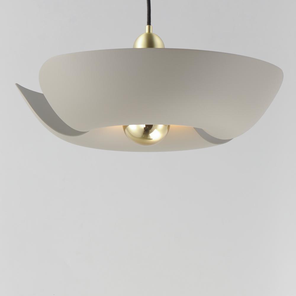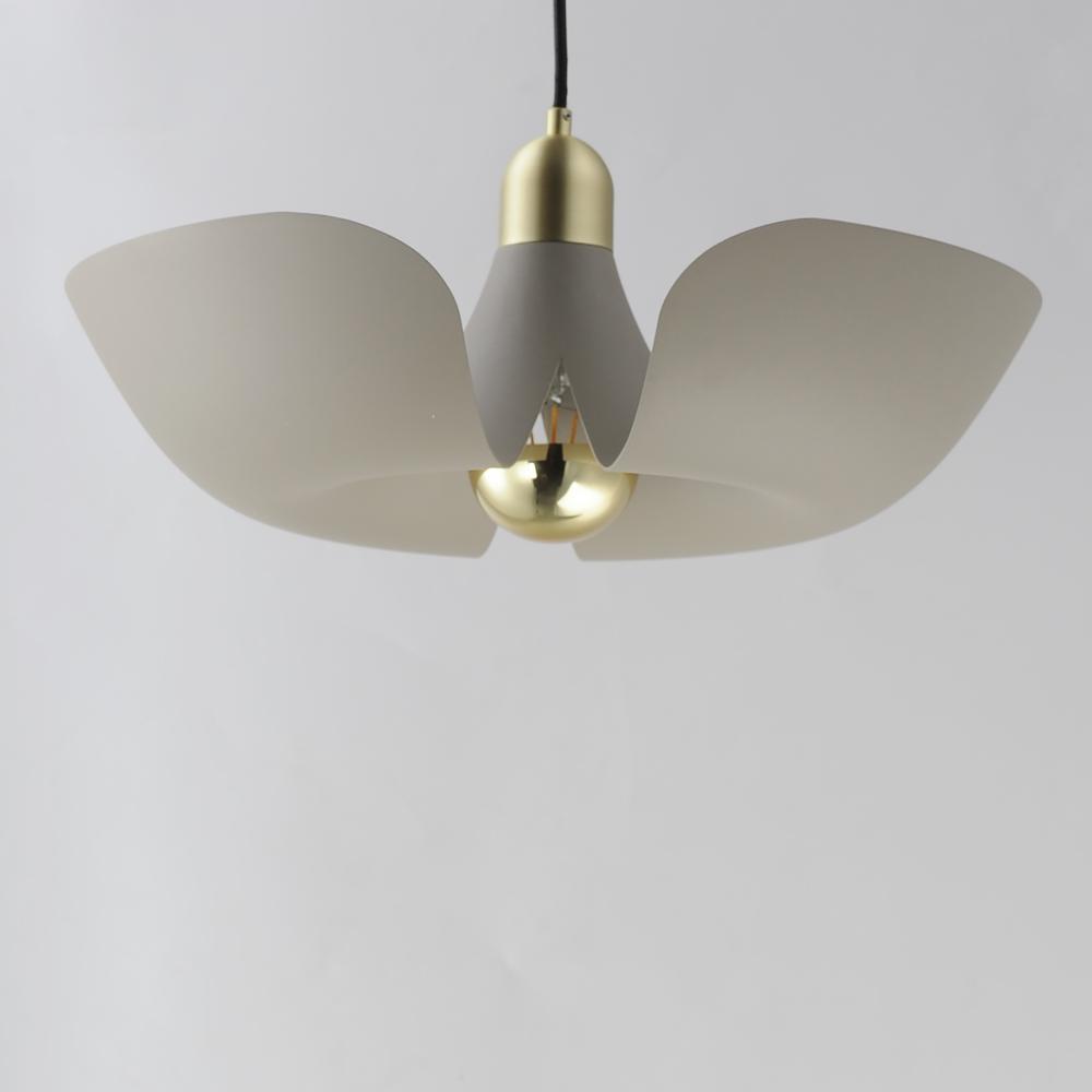 Incurved metal petals of Storm Grey or White finish with Satin Brass caps make oversized biophilic light fixtures. Available as wall sconces or pendants, the various configurations provide playful forms both nostalgic or youthful. Pair with a white G25 lam