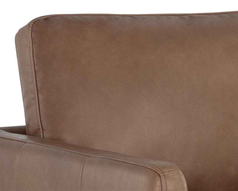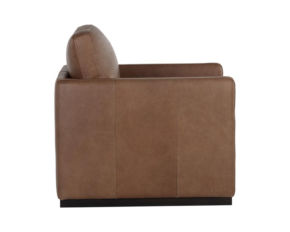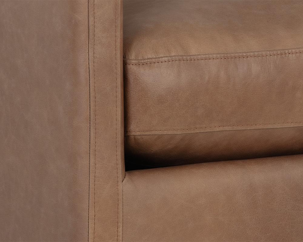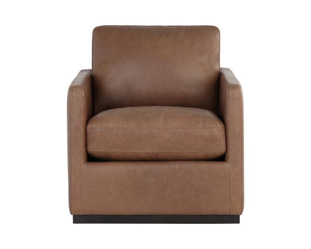 A robust swivel lounge chair. The modern design features a streamlined silhouette with track arms. Stocked in marseille concrete and camel leather. As this piece features feather-filled cushions, occasional rotation and fluffing is required to maintain its lasting comfort and beauty. Visit our Product Care page for more information. Handle with Care: This design has been crafted with 100% buffalo leather. Leather is a natural material; as such markings, wrinkles, grooves and light scratches are acceptable and appreciated characteristics. No two pieces are alike.