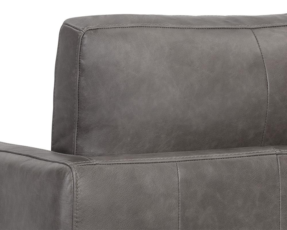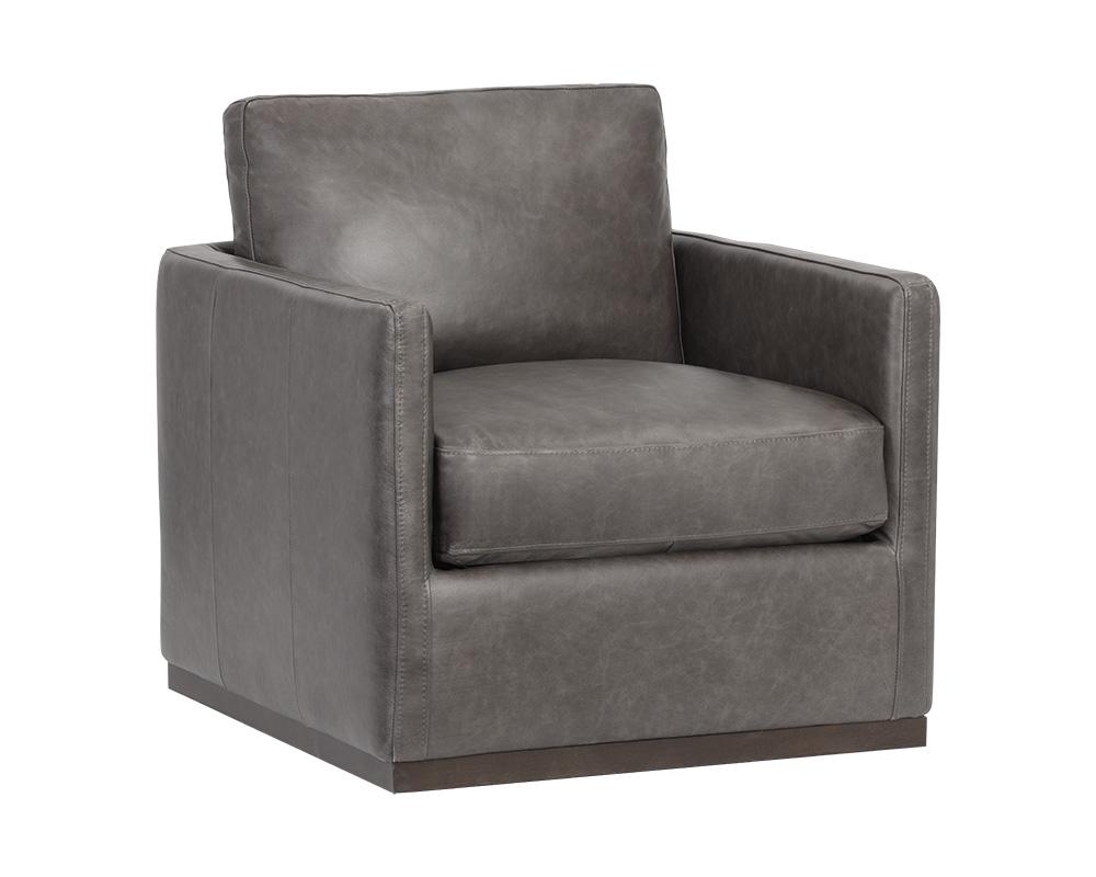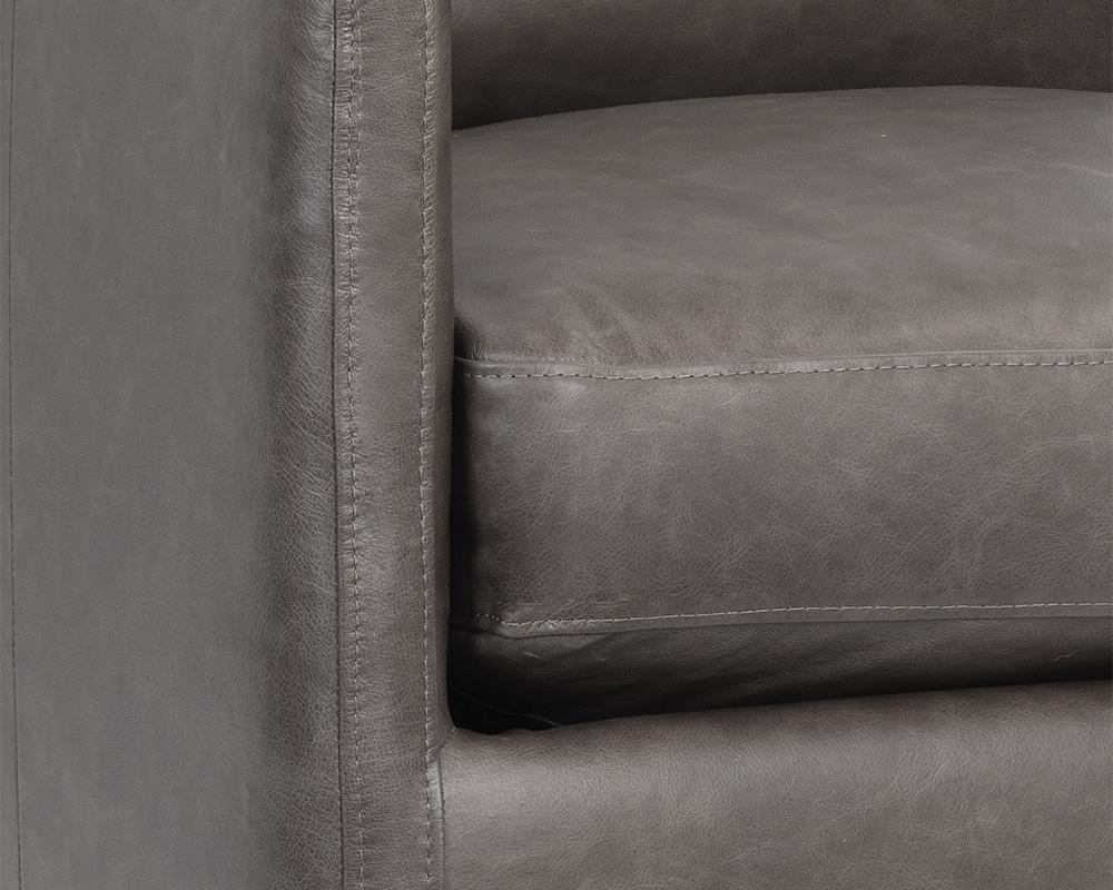 A robust swivel lounge chair. The modern design features a streamlined silhouette with track arms. In marseille concrete and camel leather. As this piece features feather-filled cushions, occasional rotation and fluffing is required to maintain its lasting comfort and beauty. Visit our Product Care page for more information. Handle with Care: This design has been crafted with 100% buffalo leather. Leather is a natural material; as such, colour variations, markings, wrinkles, grooves and light scratches are acceptable and appreciated characteristics. No two pieces are alike.