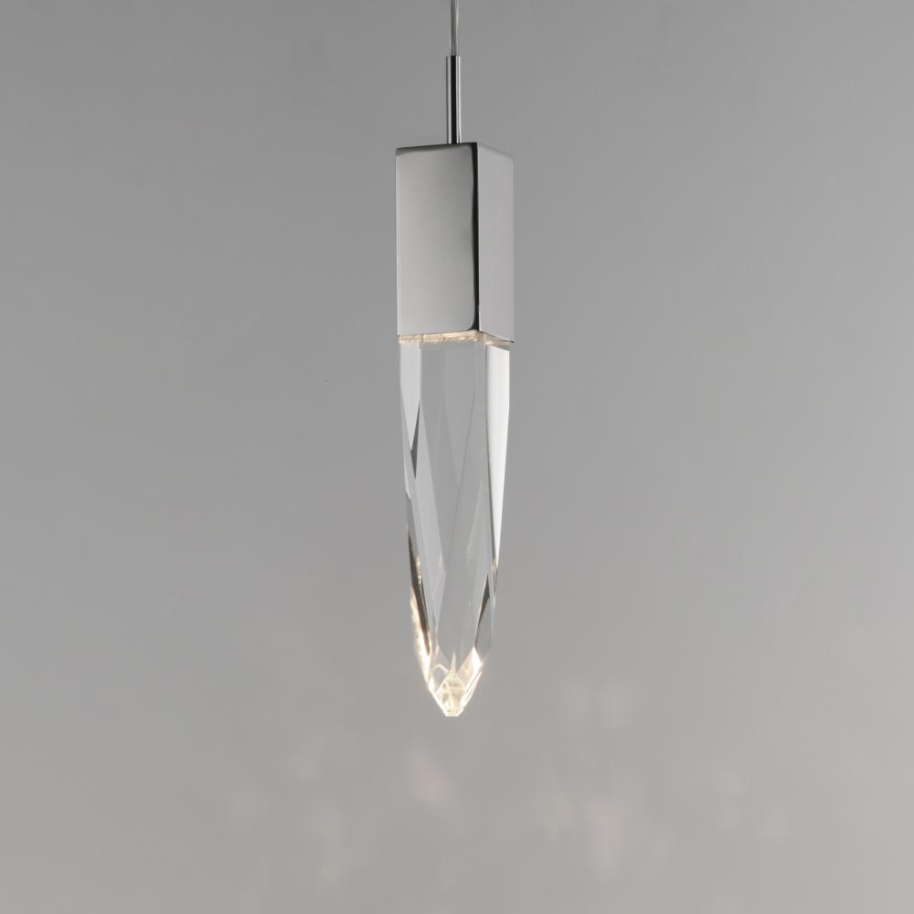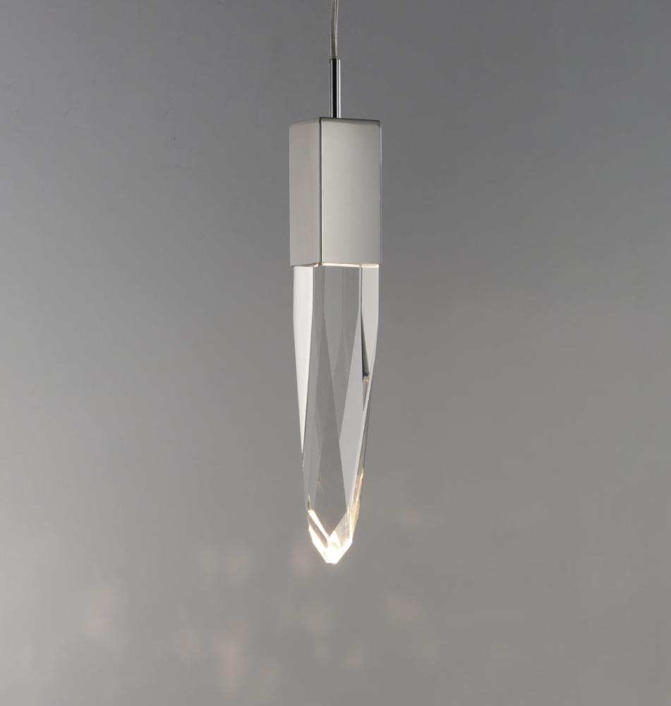 Stalactites of Clear Beveled crystal suspend from your choice of Polished Chrome or Black supports, can be hung at various heights to create a spectacular array. The crystal shimmers as light diffuses through the facets powered by 90 CRI LED dimmable modul
