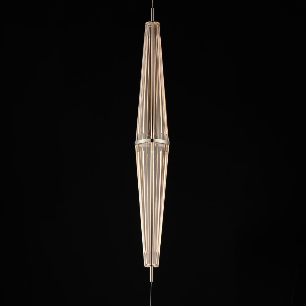 A arrangement of stainless steel and light guided acrylic form elongated rhombus shapes discreetly lit by LED. On the larger size pendants an additional aircraft cable kit is provided so that you can mount the pendants either vertically or horizontally at