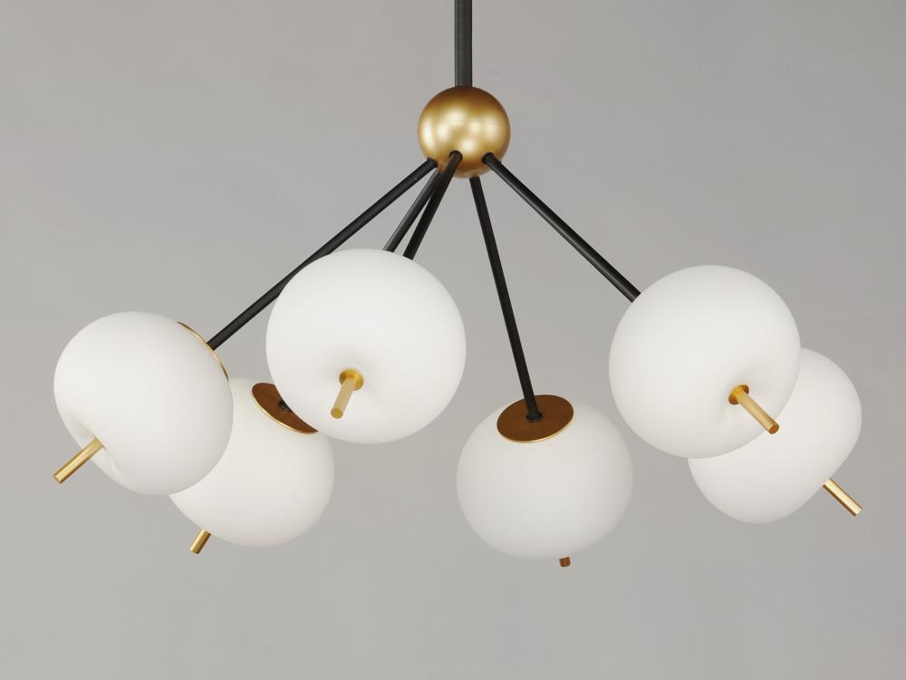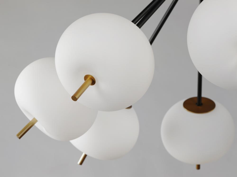 Inspired by contemporary Euro design, this collection features Satin White cased glass fonts suspended by rods of Gold with Black accents. Powered by integrated LED modules, light is directed downward in a soft and diffused manner.