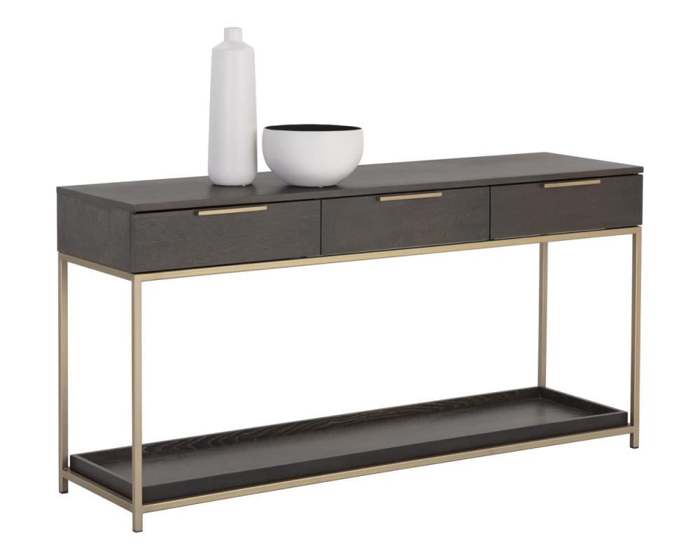 A modern console table designed to add a beautiful touch to living and lounge spaces. Crafted from charcoal grey oak wood veneer with three drawers and shelf for added storage. Brushed gold iron hardware completes the look. Can be paired with matching coffee and dining tables.