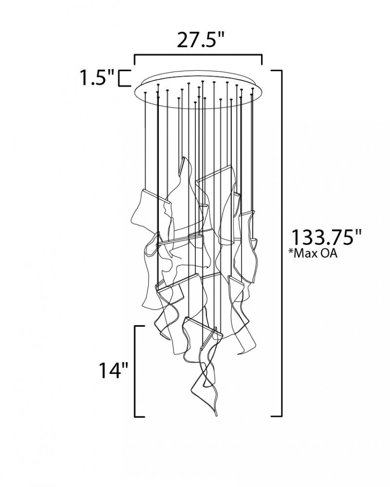 An airy arrangement of abstract forms, the Rinkle pendants feature sheets of transparent acrylic shaped by hand. The light guided acrylic captures the glow of energy efficient LEDs recessed within strips of shining stainless steel, obscuring the source of