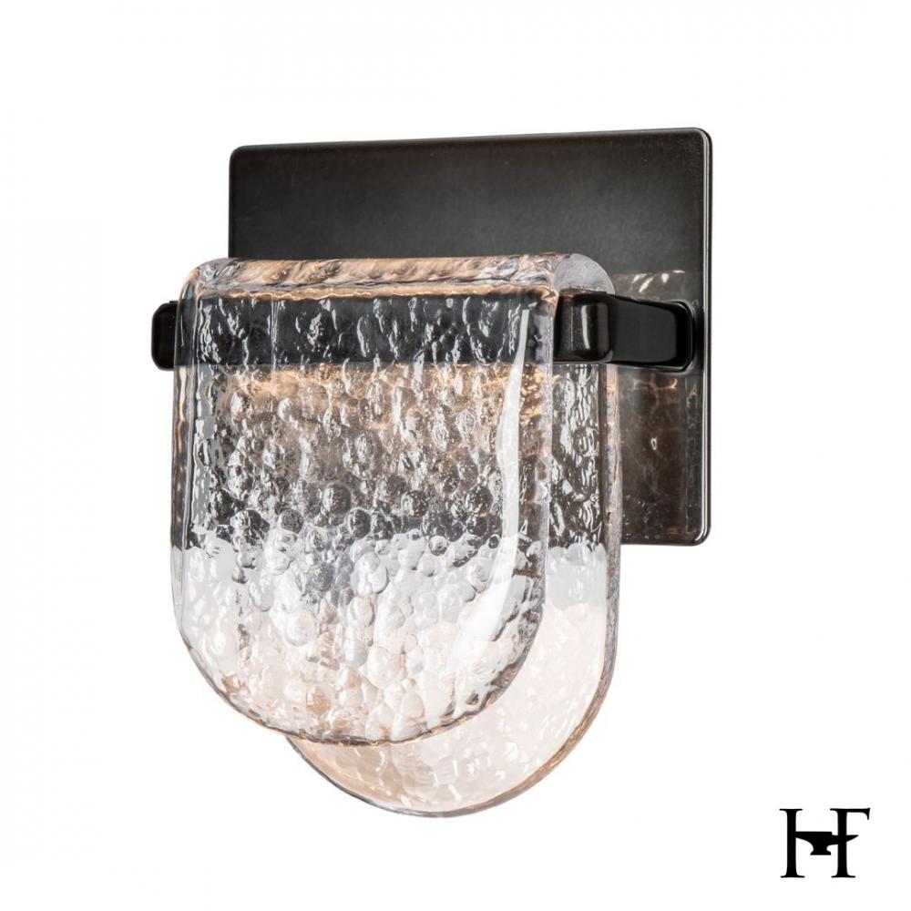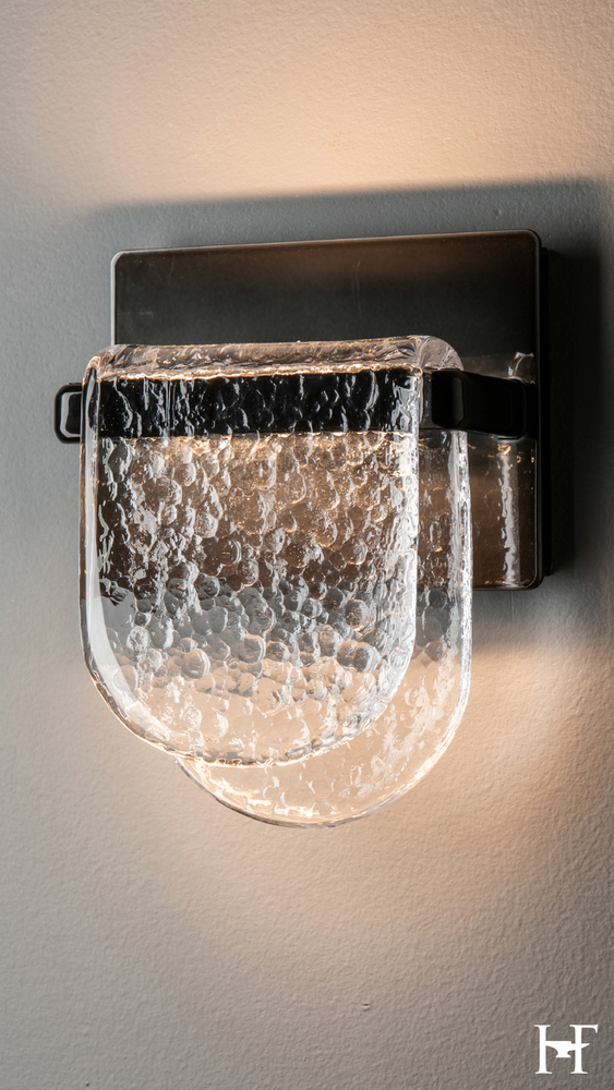 Small and stunning. This glass is beautifully hand-crafted by our friends at AO Glassworks in Vermont. Clear, heavily textured glass is hand-poured and shaped to create this unique wall sconce. The thick glass bends over a small metal bar, giving it the delicate whimsy of a meandering riverbed.