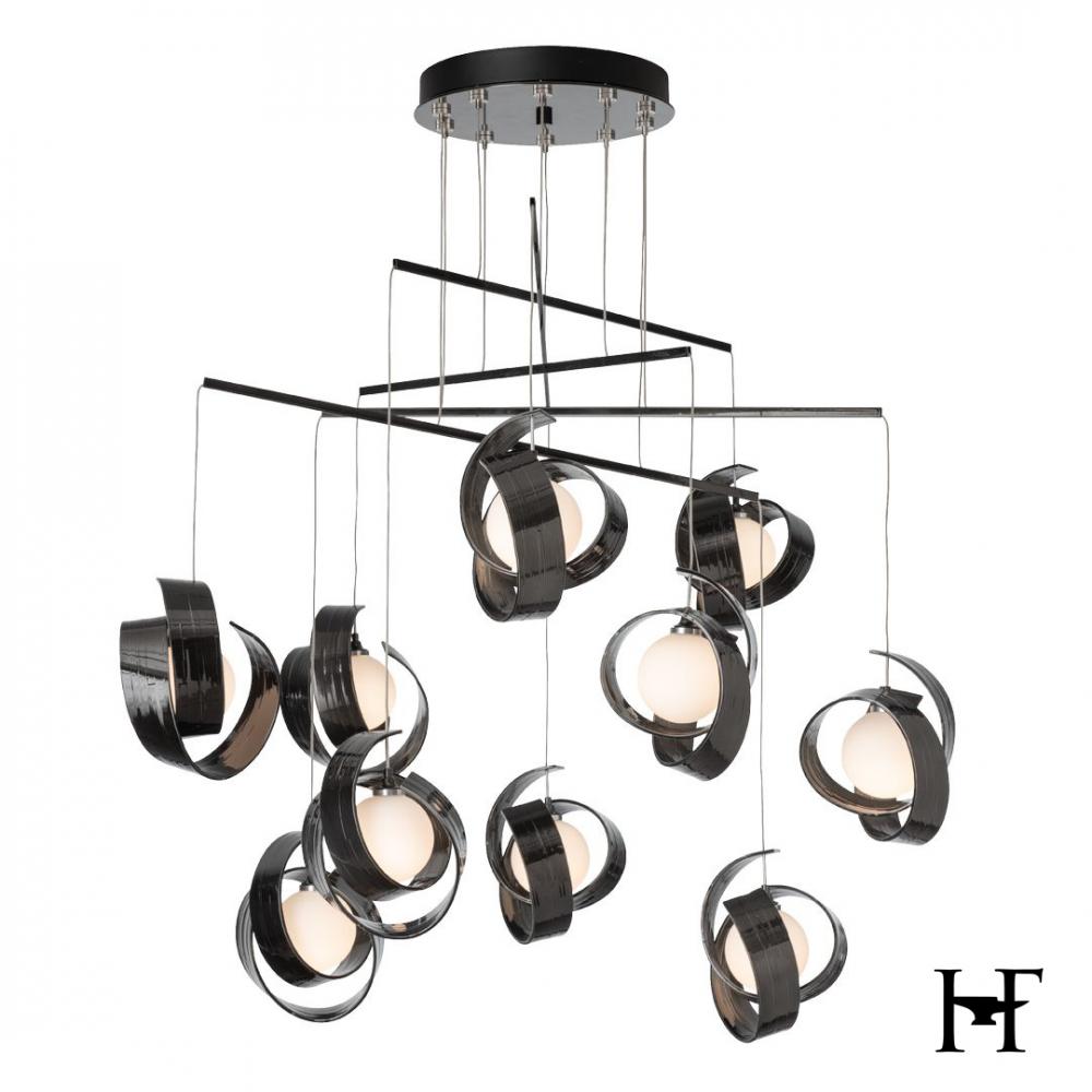 Each Riza curl is hammered and shaped to create this stunning display. The mobile platform minimizes the canopy, while the delicate metal tubes guide the cables providing not just great breadth, but also a highly-adjustable fixture. Riza elements are artfully balanced for a unique feeling of both depth and whimsy.