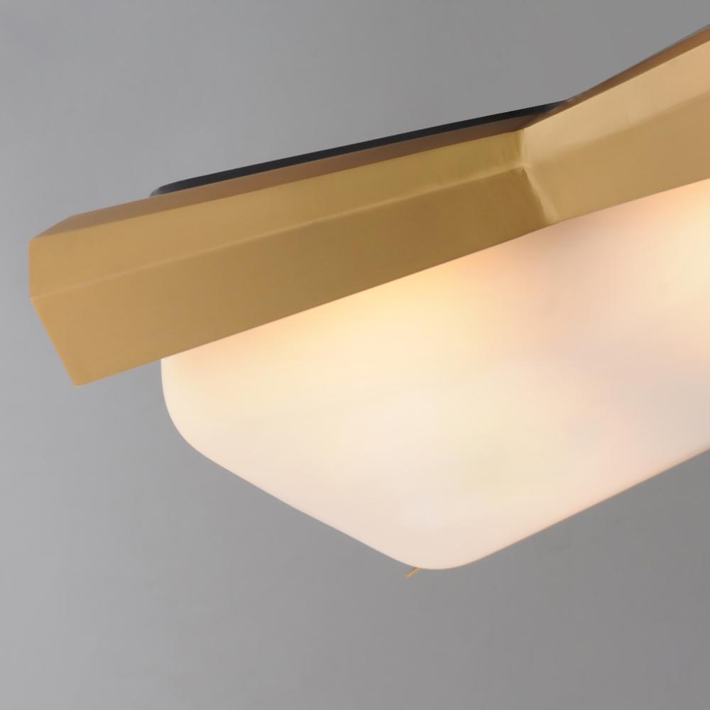 The Rizzo collection exudes stylish flair and spirited design, combining faceted metal shades in Natural Aged Brass with striking Matte Black accents. A flat-bottomed Satin White glass shade protrudes gracefully from the base of each metal shade, deliverin