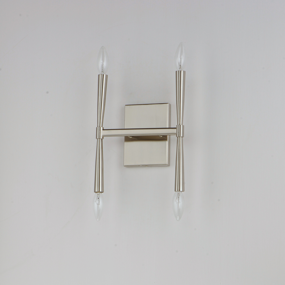 Civic styling using straight rectilinear channels radiating from a central connector. The light sources flare out both up and down with tapered candle covers creating a form evocative of a classic torch. Available in matte Black, Satin Brass, and Satin Nic