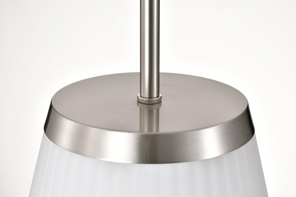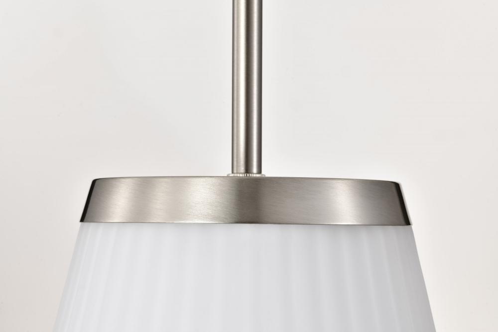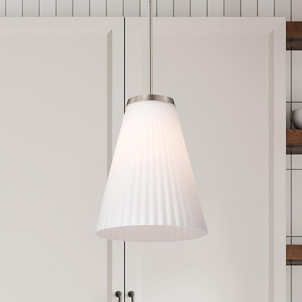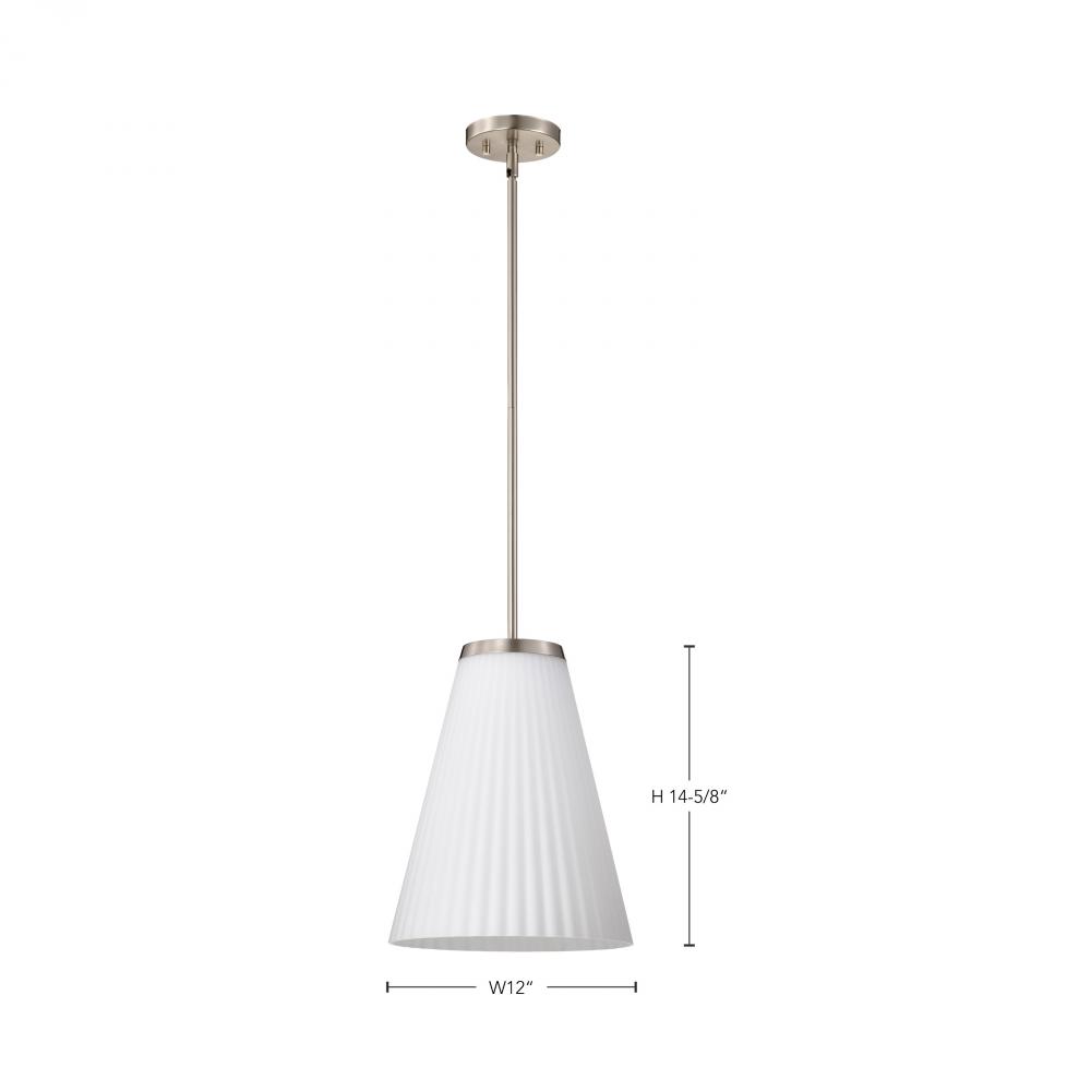 Indulge in the glamour of the Royale 60-8738 one light large pendant, where sleek Art Deco silhouettes meet modern refinement. The satin white pleated glass adds texture and sophistication, diffusing light with a soft, radiant glow. Finished in brushed nic