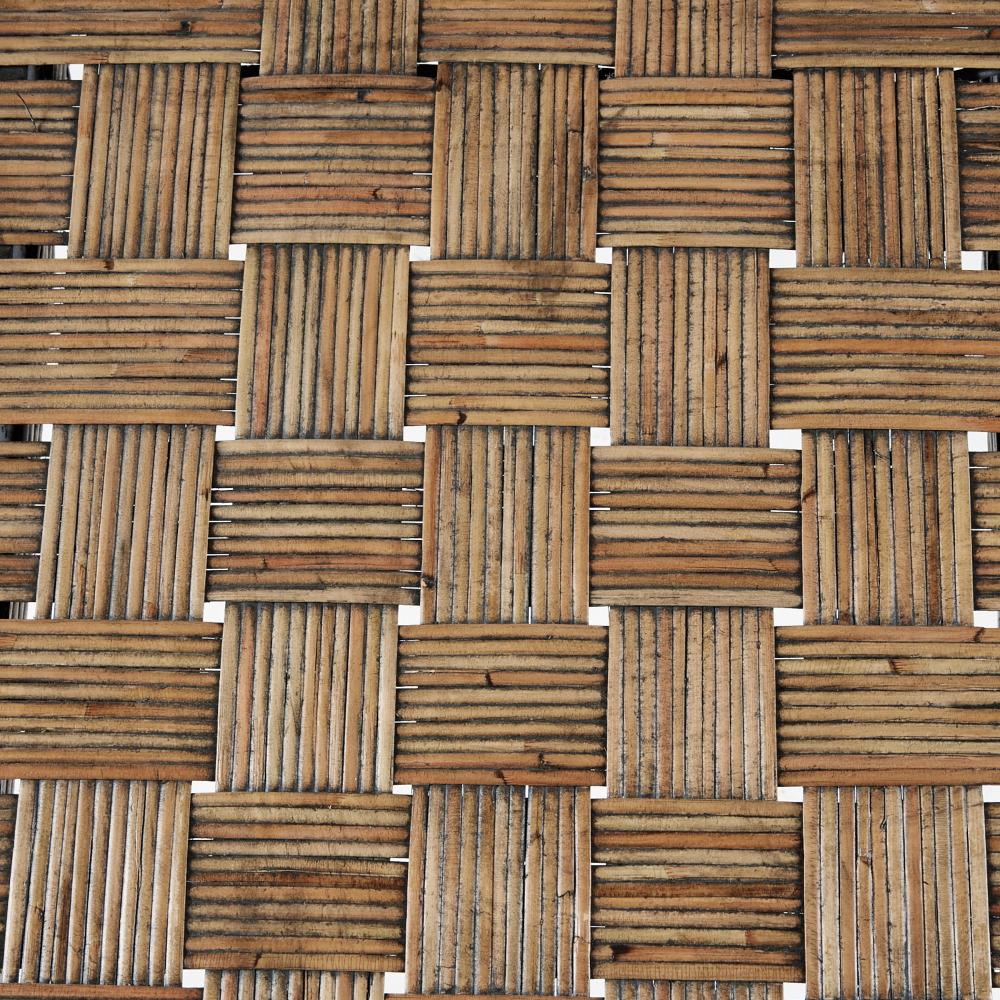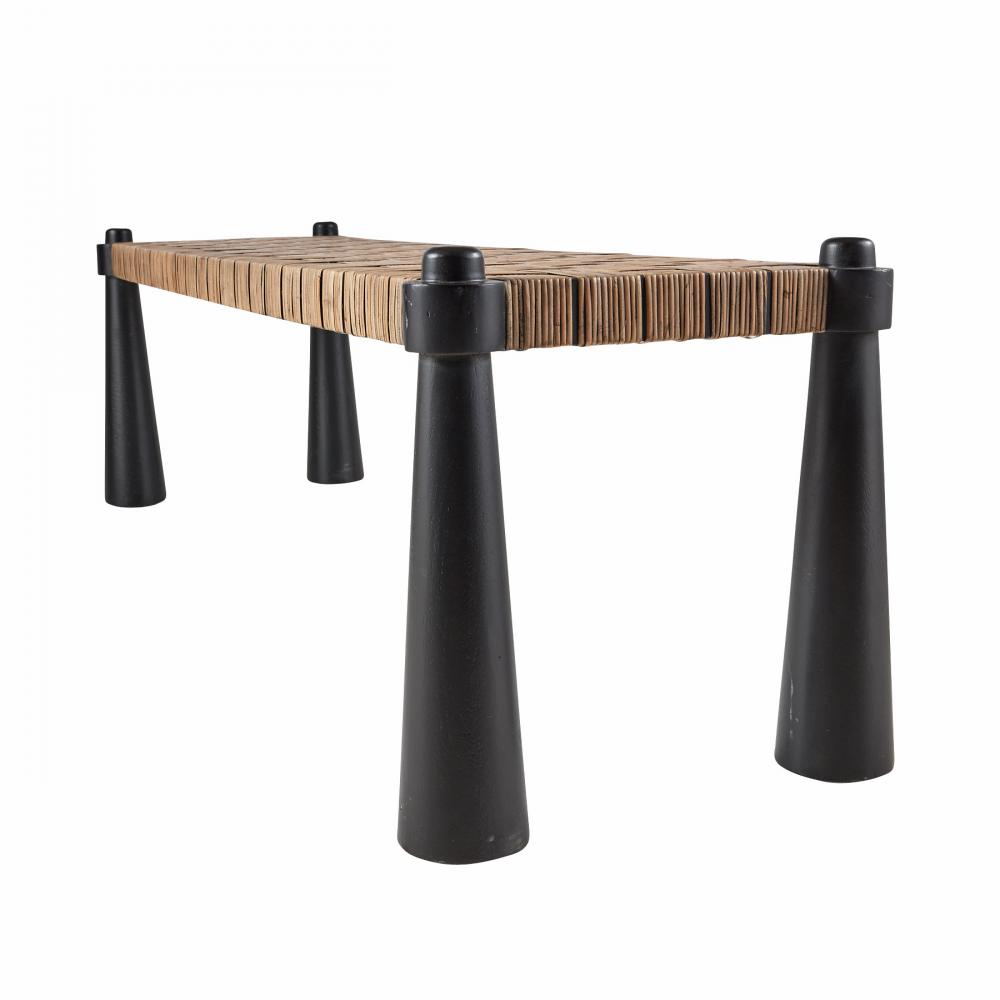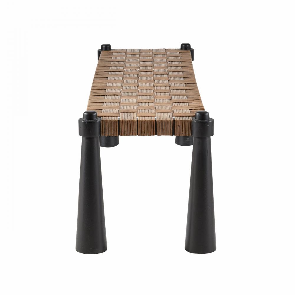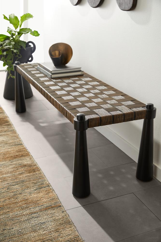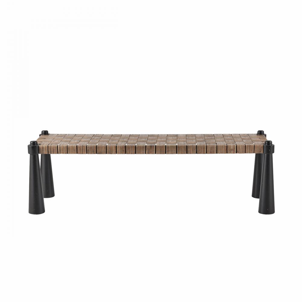 A rustic yet refined wooden bench lends an organic accent to any seating area. Natural tobacco-wash rattan is framed in sable mango wood pillars with a pierced effect at each corner. Finish will vary.