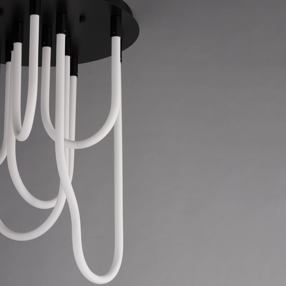 Sweeping matte white acrylic tubes encase an omnidirectional LED light source, arranged in abstract configurations inspired by solar flares. Minimal in composition yet dramatic in form, the Soleil collection offers a striking lighting solution. Available i