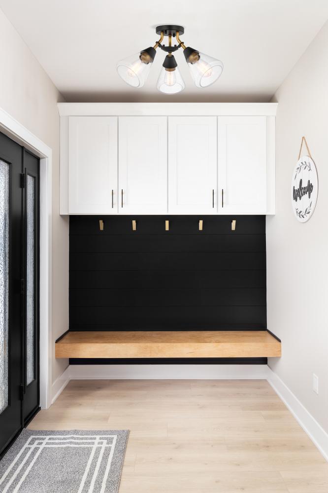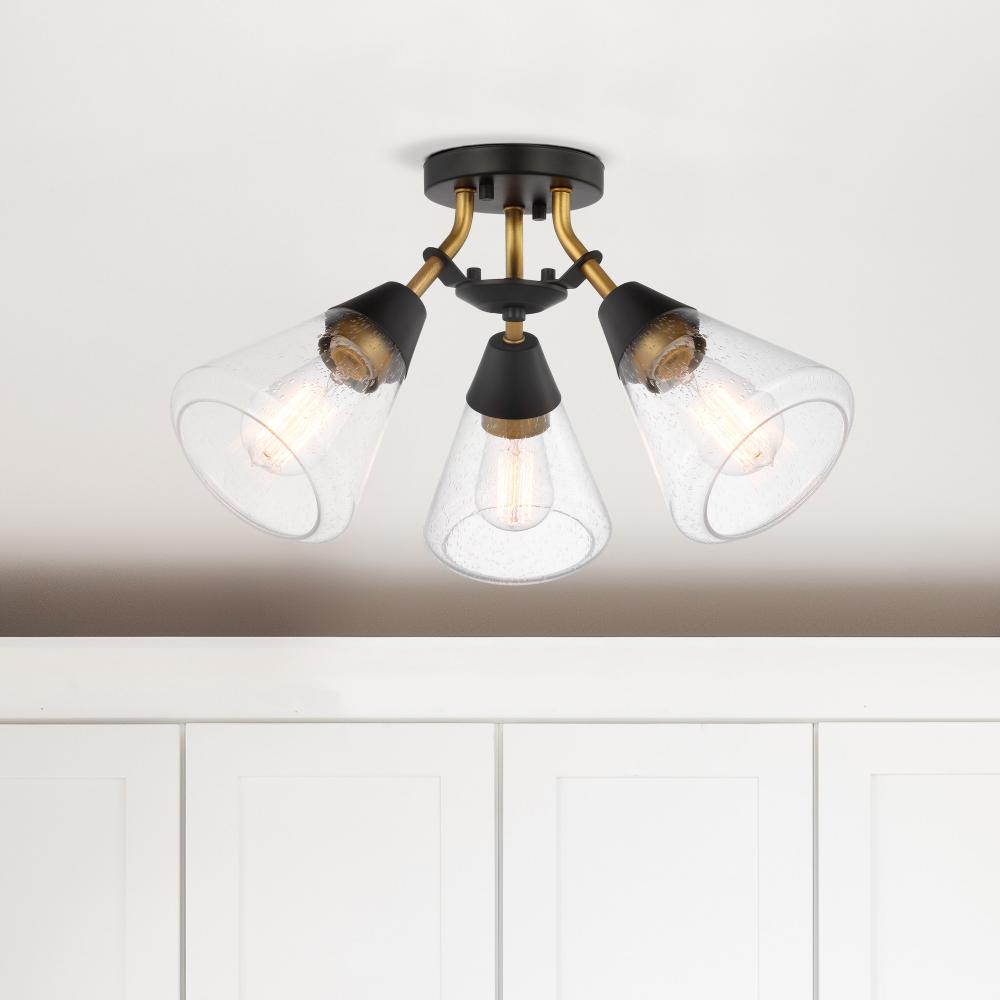 Mid-century charm in a stunning silhouette graces the Starlight 60-7684 three light semi-flush mount. This design is offered in matte black with a pop of brass, adding interest. The antique -inspired seeded clear glass continues the timeless style througho