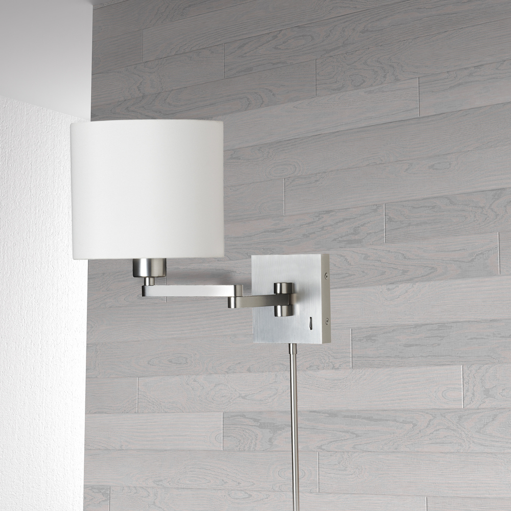 A classic look gets a conveniently modern makeover in the Arm Swing Lamp collection. It's a versatile design with a classic profile, and adjustable placement you can customize. The metal frame comes in a subtle satin chrome finish, contrasting a white fabric shade in your choice of drum or tapered drum shape. It's the perfect way to add spot lighting in areas where floor space is at a premium. With its nod to traditional forms, its sleek modern silhouette adds an element of luxury and style to living rooms, hallways or office suites.