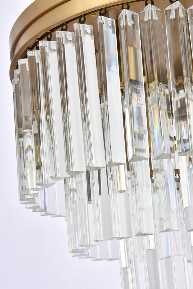 The round flush mount features 3 tiers of triangular slender crystal rods, providing a stunning cascade of shimmering light and creating a sense of opulence.