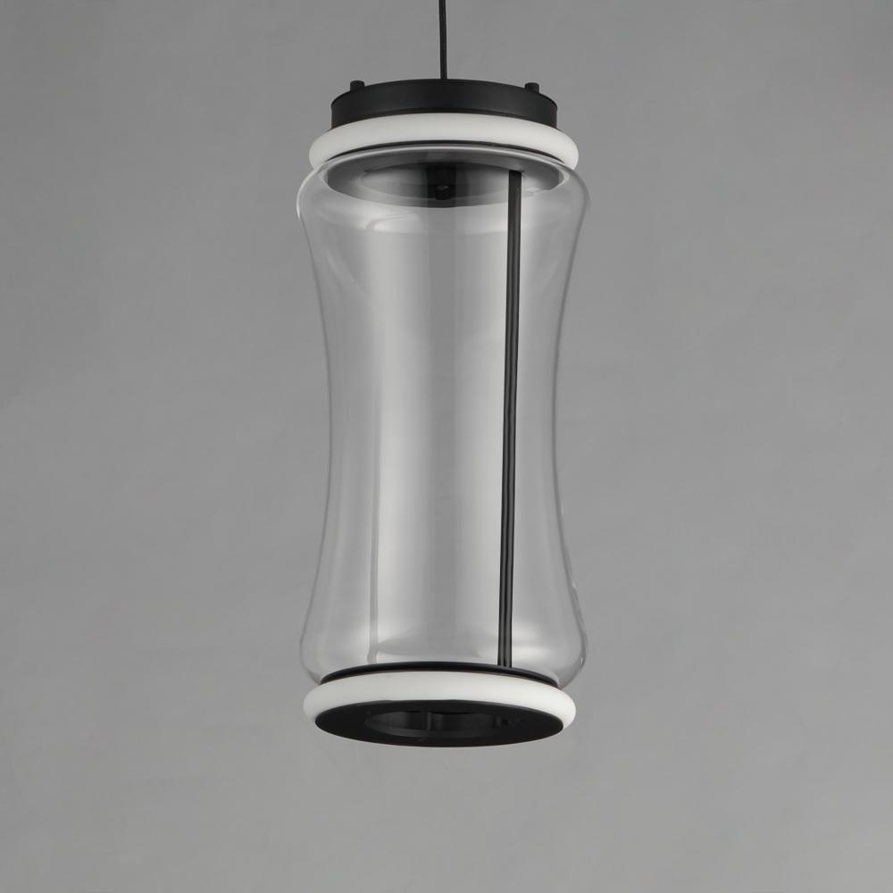 Segmented by bright LED rings finished in Matte Black, glass shades of an hourglass shape are combined into various configurations. The hand-blown glass is entirely transparent and varies in size creating an undulating pattern. All together, the series inc