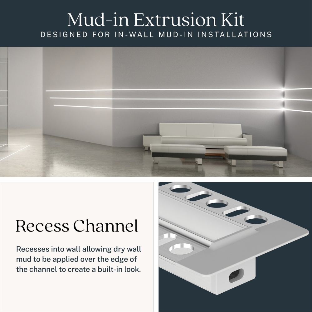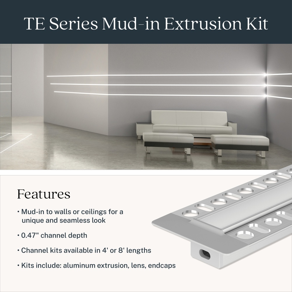 Achieve a seamless, integrated lighting solution with the TE Series Mud-In 8ft Extrusion Kit. Engineered for in-wall mud-in installations, this recessed channel kit incorporates standard depth, wide side flanges, and a grooved underside to facilitate efficient drywall mud application, resulting in a clean architectural finish. The White Opaque PMMA lens is designed to snap securely into place, providing reliable installation and consistently diffused illumination. Precision-fit end caps with wire pass-through openings, this kit delivers a professional look, modern look.