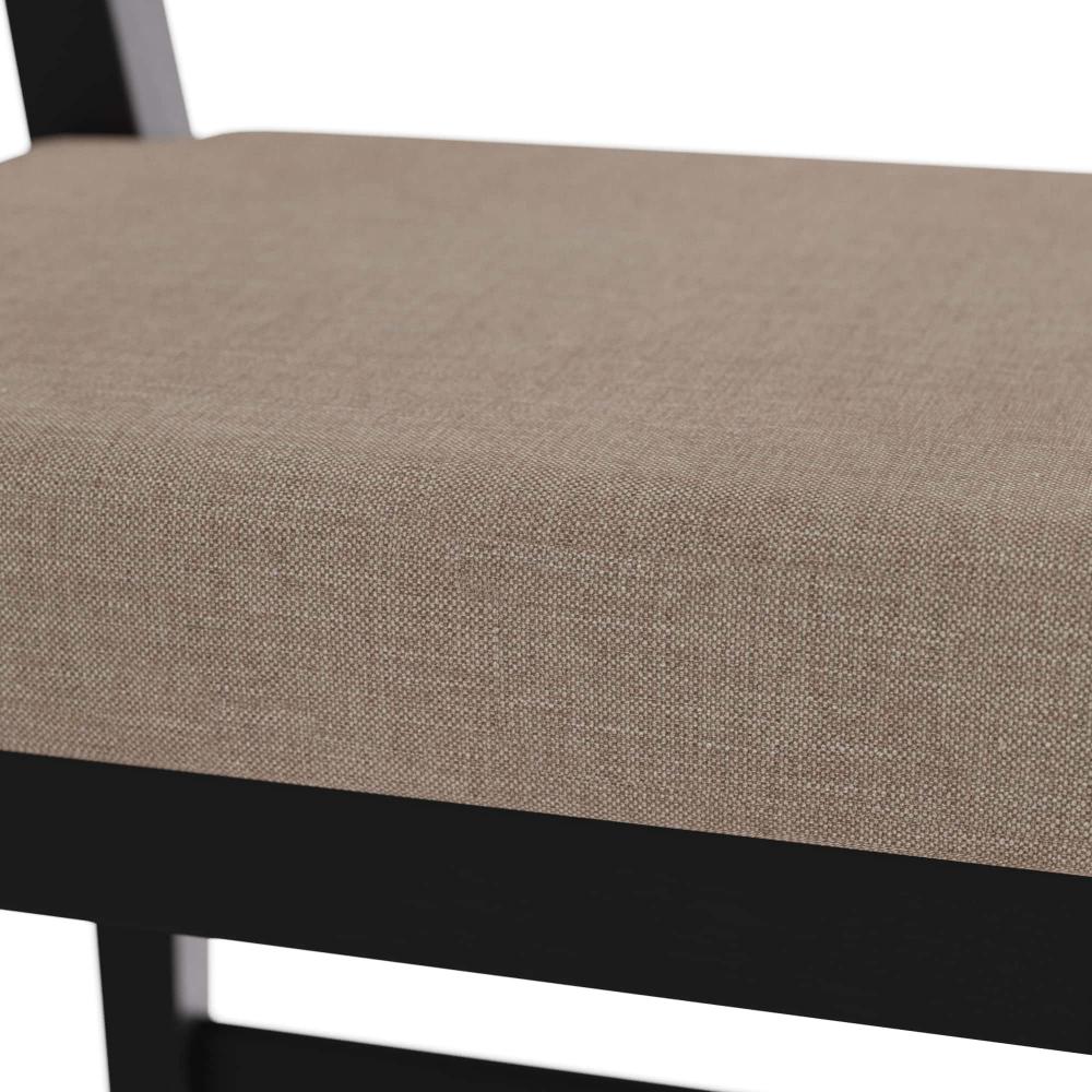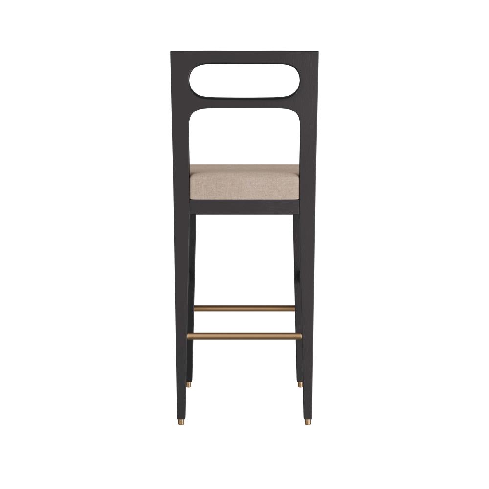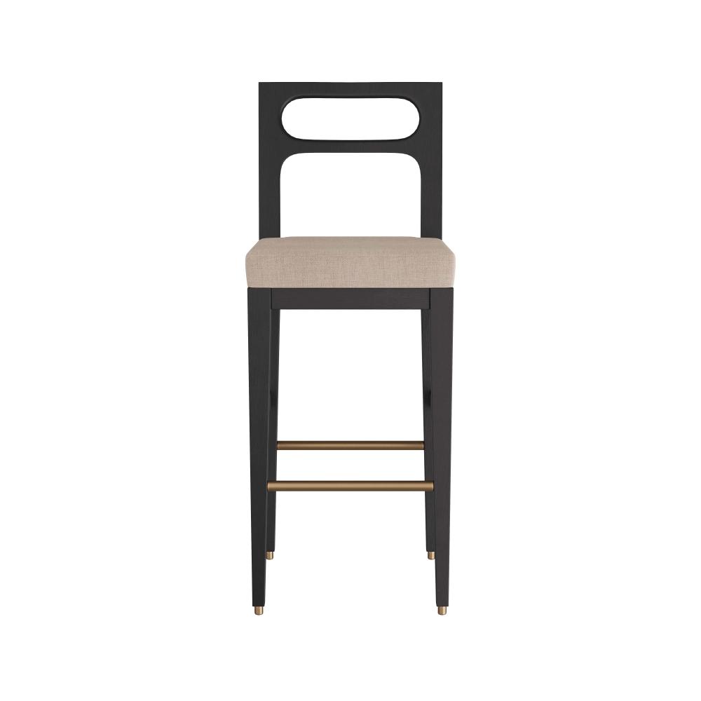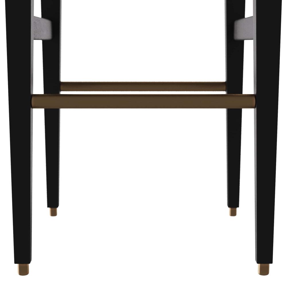 INSPIRED BY MIDCENTURY, ITALIAN, LADDER-BACK CHAIR CONSTRUCTION, OUR THADEN BAR STOOL IS REIMAGINED WITH THOUGHTFUL DETAILS AND SOFT, MODERN CURVES. THE SIMPLE, YET ELEGANT, CHAIR IS CRAFTED IN EBONY MANGO WOOD, WITH TAPERED LEGS, AND WITH A NATURAL LINEN SEAT. RECESSED SABOTS AND A STRETCHER IN ANTIQUE BRASS COMPLETE THE PIECE. FINISH WILL VARY.