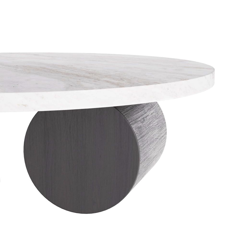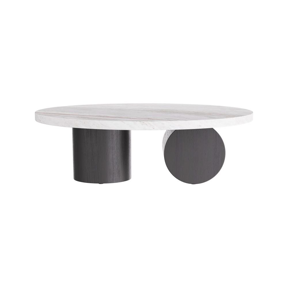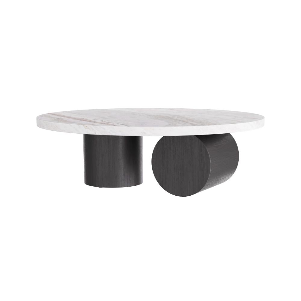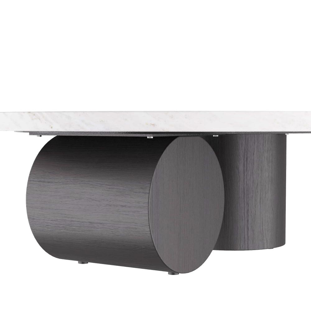 OUR SCULPTURAL TORRINGTON COFFEE TABLE IS EXECUTED WITH A MINIMALIST SENSIBILITY WITH A FOCUS ON GEOMETRY AND THE EXPLORATION OF FORMS. THE MONUMENTAL TABLE IS CRAFTED IN A TORONTO LEATHERED MARBLE OVAL TOP, WITH ROBUST COLUMNAR, EBONY OAK SHAPES FORMING THE BASE PEDESTALS. FINISH WILL VARY.