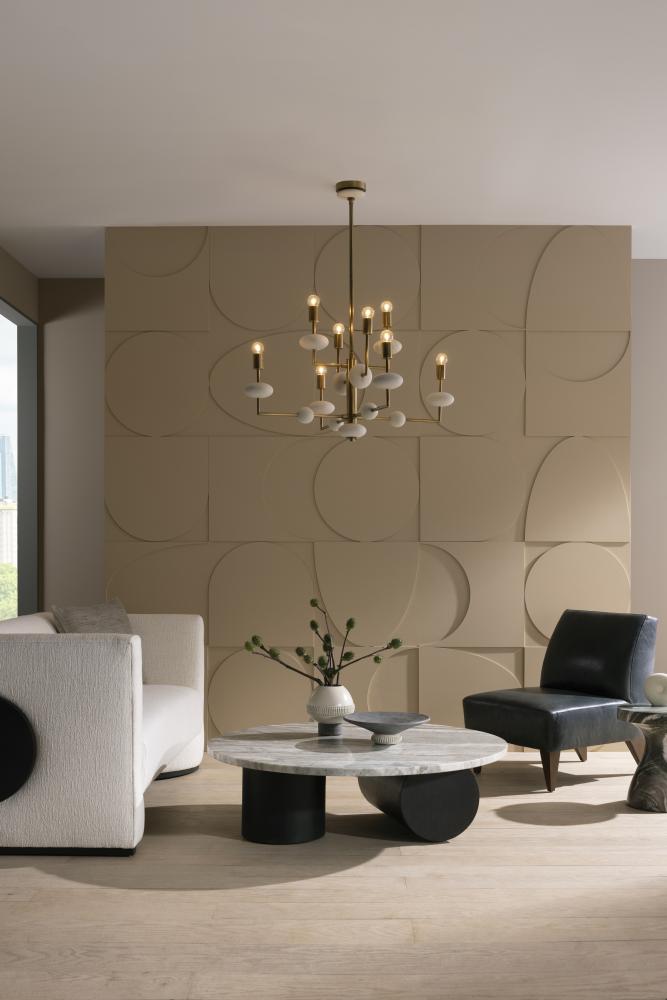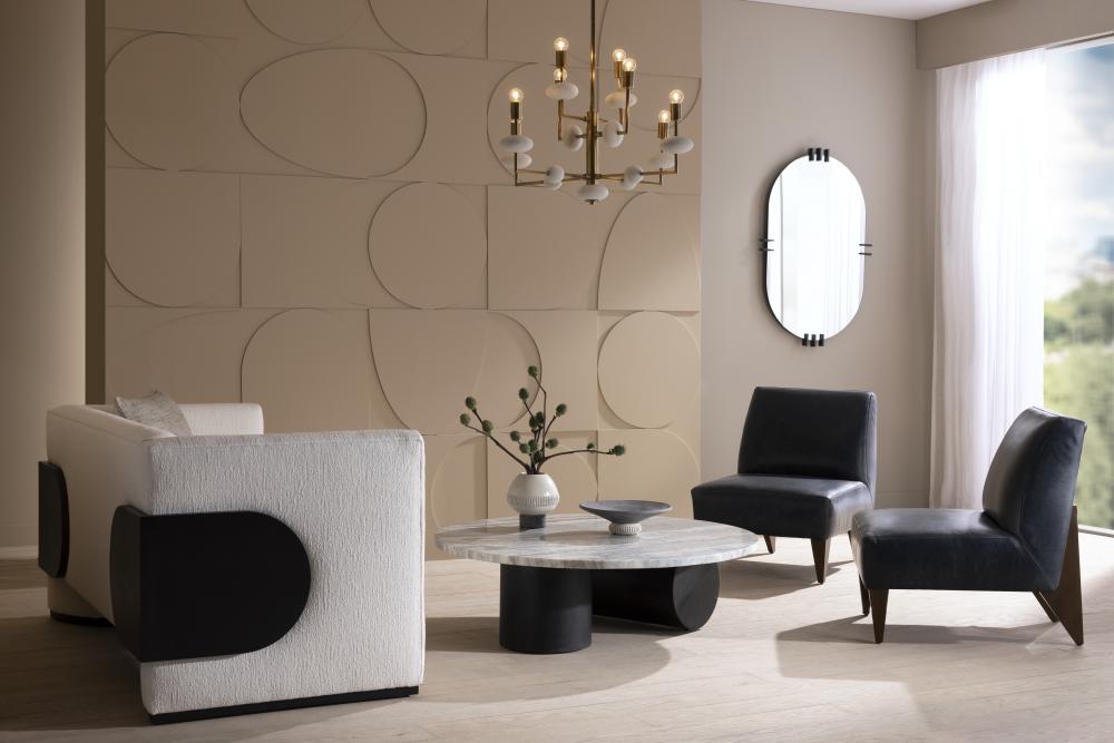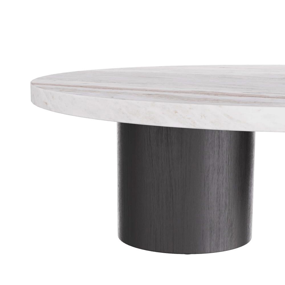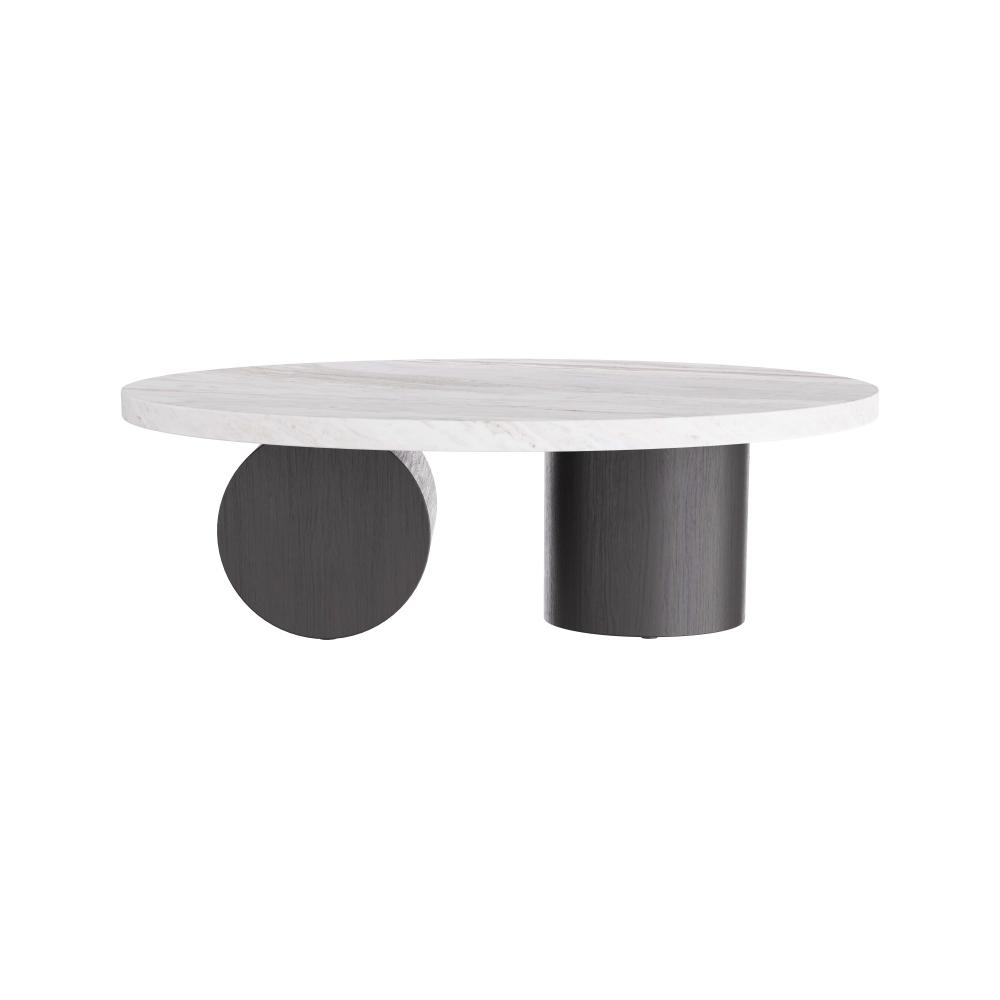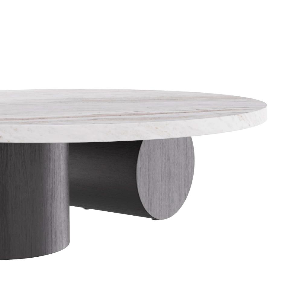 OUR SCULPTURAL TORRINGTON COFFEE TABLE IS EXECUTED WITH A MINIMALIST SENSIBILITY WITH A FOCUS ON GEOMETRY AND THE EXPLORATION OF FORMS. THE MONUMENTAL TABLE IS CRAFTED IN A TORONTO LEATHERED MARBLE OVAL TOP, WITH ROBUST COLUMNAR, EBONY OAK SHAPES FORMING THE BASE PEDESTALS. FINISH WILL VARY.