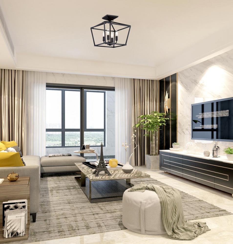 When you have a traditional aesthetic and want to inject a sense of modernism, choose this Townsend ceiling fixture. It’s a classic lantern style with the familiar vintage appeal of colonial or old English candle fixtures, but the open geometric frame and matte black finish create a delightful contemporary twist. This timeless quality blends very well with your traditional, transitional, bohemian, contemporary or modern farmhouse decor. Four lights within the open framework have metal candle covers and hold 60W candelabra size bulbs. The fixture is 13" wide and 13" high with a semi-flush mounting, making a superb fit for your dining room, kitchen, living room, entryway, bedroom, closet, family room, office, stairway or great room.