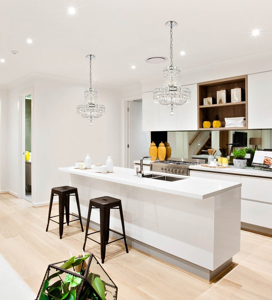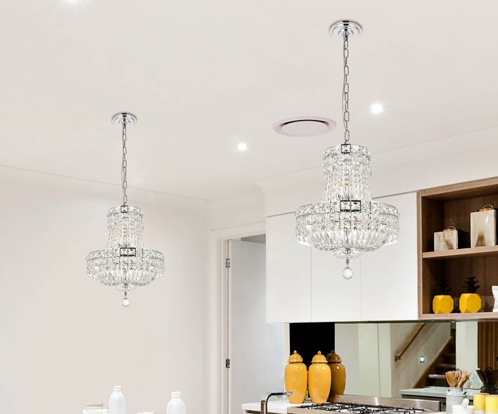 The Tranquil collection of hanging fixtures is everything you could imagine in the most decadent of lighting for your home. Captivating and serene, the radiance of this masterpiece will make you feel like a waterfall of lustrous sparkle enraptures you. Chrome-finished bands of exquisite emerald-cut and baguette jewels are finished off with a mesmerizing spherical gem. These hypnotizing chandeliers and hanging pendants will add a touch of panache to your kitchen, dining room, foyer, or bedroom.