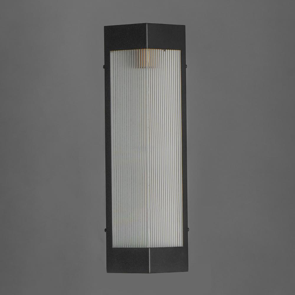 A transitional design suitable for both modern and more traditional applications, this outdoor series of lighting features Clear Ribbed glass that refracts the light source within triangular frames. A Black frame with warm Antique Brass light clusters with