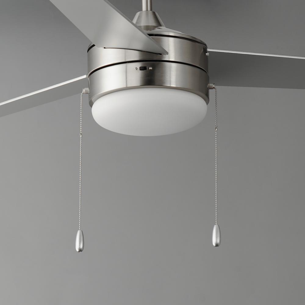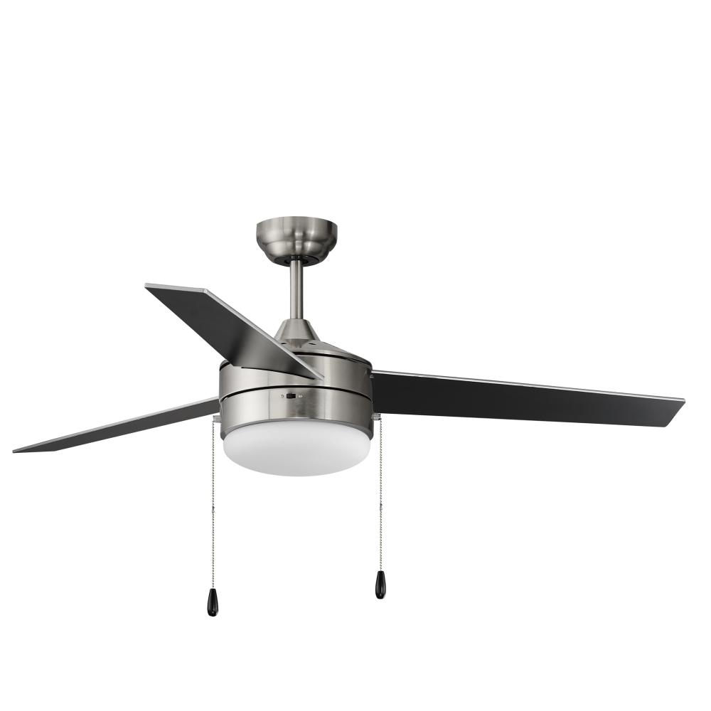 A contemporary, yet transitional look at economical pricing, the Trio fan is finished in Satin Nickel with 3 straight fan blades in Black on one side and silver on the other side. The fan is powered by an included wall control or pull chain as well as LED