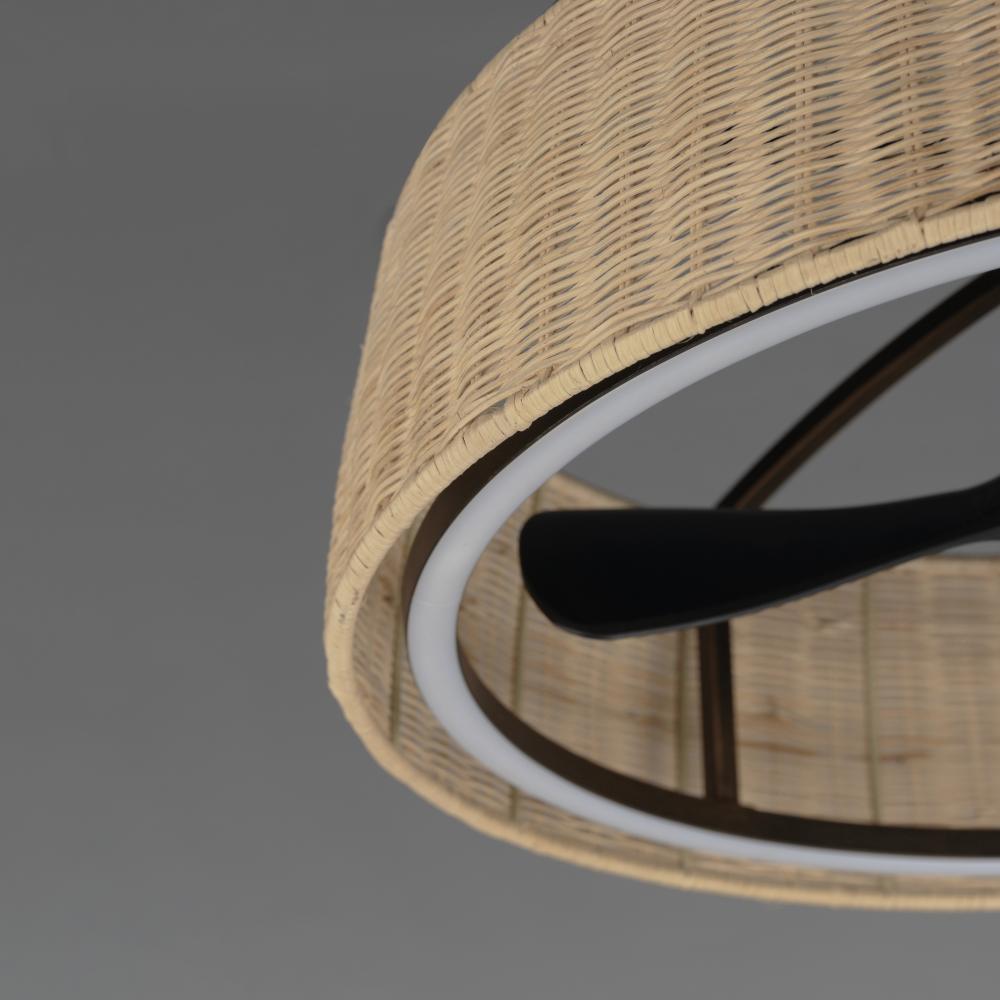 Hand-woven rattan wicker in a natural or darkened finish are shaped into a sloping drum shade with an internal fan and LED light source within them. The contrasting Dark Bronze finish of the metalwork encases an LED ring toward the bottom edge of the shade