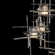 The Tura's perpendicular intersecting metal pieces are crafted from annealed aluminum that are hand textured using a trip hammer and custom dies by Vermont artisans. Nine pendants with frosted glass shades, are each customizable in length on a round canopy to create the ideal staggered effect to suit its space. The Tura 9-Light multi-port chandelier is a stunning focal point, and available in all standard finishes.