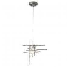 This Tura Mini Pendant is composed of perpendicular, intersecting handcrafted annealed aluminum pieces that form an exoskeleton that surround a thick, clear double layer of seeded glass. Suspended from a discrete round canopy, electricity is delivered via the pendant's low voltage cable. Available in all standard finishes.