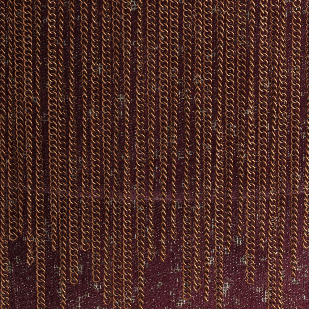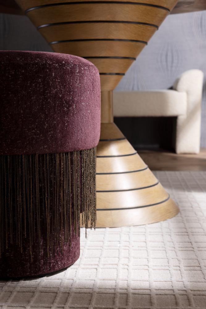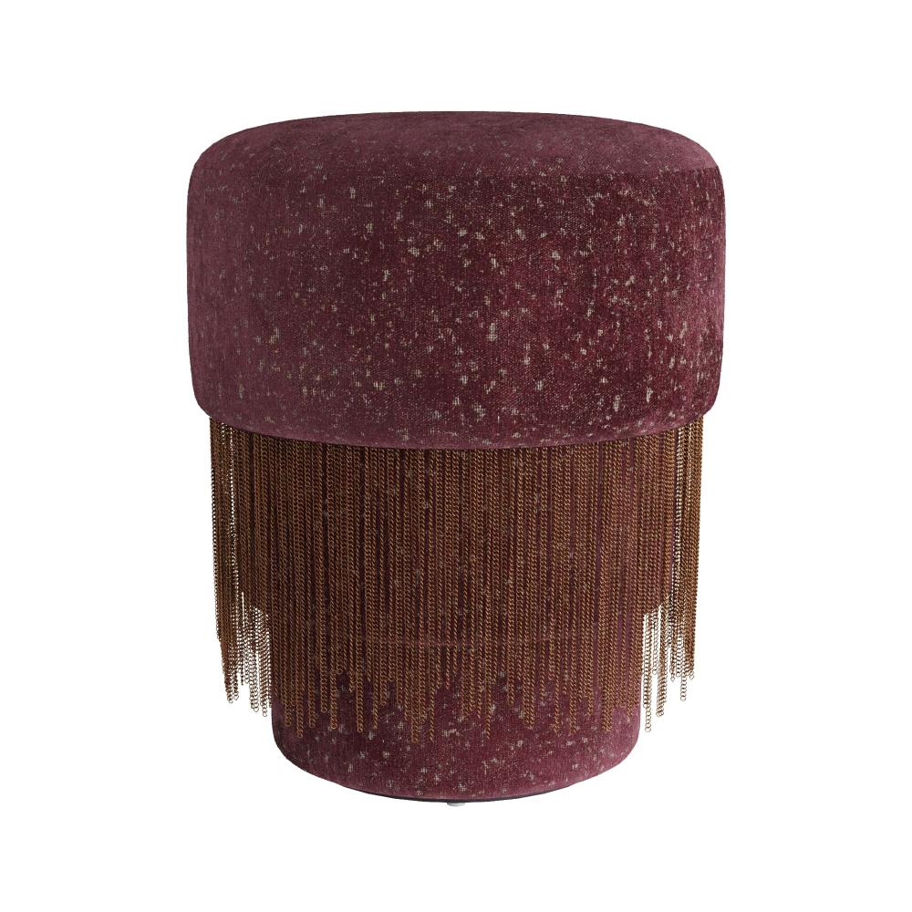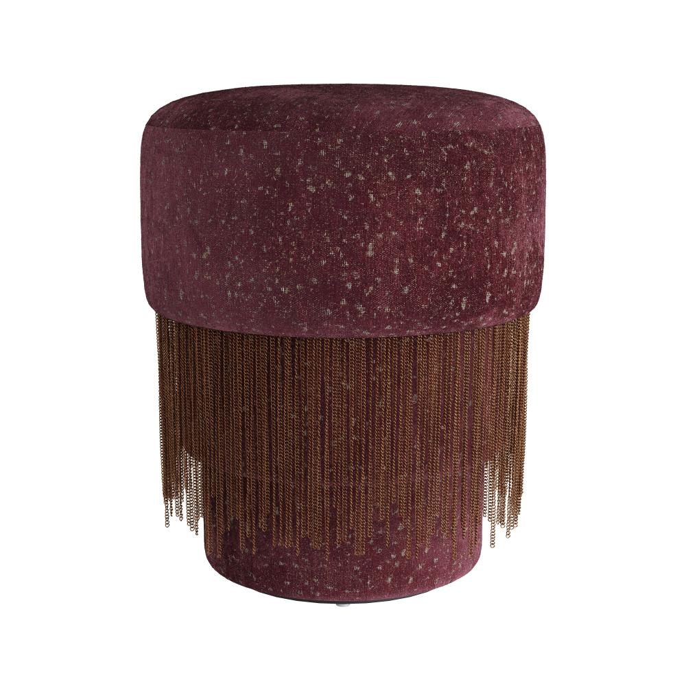 OUR TWYLA OTTOMAN ADDS A PLAYFUL TOUCH OF NOSTALGIA WITH THIS UNIQUE COMBINATION OF COLOR AND MATERIALS. THE EXPRESSIVE STOOL IS FULLY UPHOLSTERED IN HEATHERED BORDEAUX CHENILLE, WITH A FULLER TUFFET RESTING UPON A SLIMMER COLUMN PLINTH. FINE, ANTIQUE BRASS CHAIN, IN VARYING LENGTHS, FORMS A FLAPPER-STYLE FRINGE SKIRT. FINISH WILL VARY.