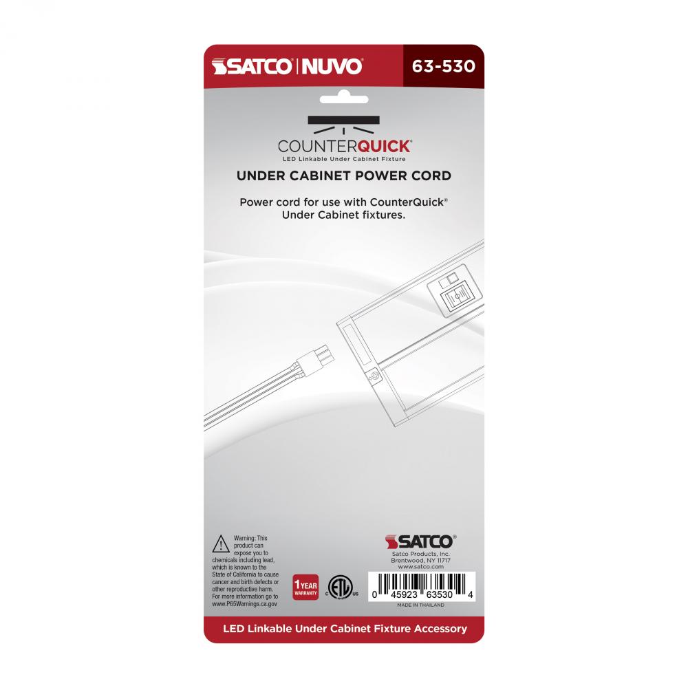 The 63-530 CounterQUICK power cord in black makes installation simple for standard plug-in applications. This 5 foot cord can be used with Satco under cabinet lighting and Smart under cabinet lighting as well. Only one power cord needed when linking multiple CounterQuick sets.