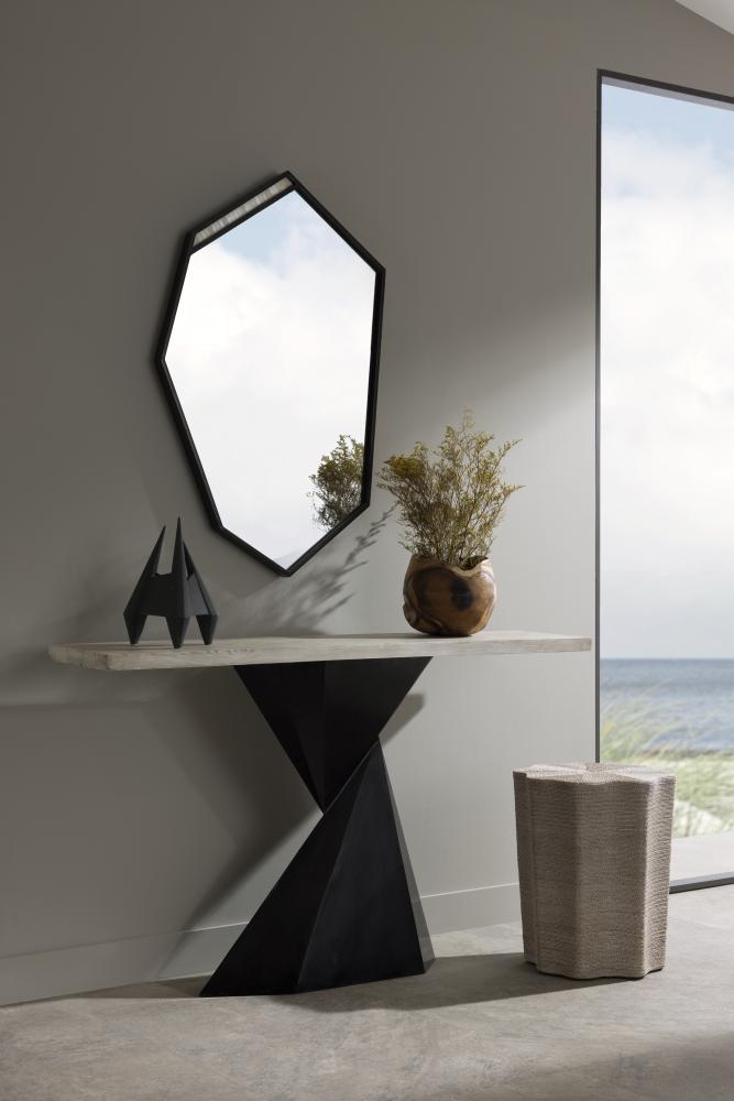 SLEEK AND MODERN, OUR VALDER CONSOLE WAS INSPIRED BY THE TIGHT PAPER FOLDS IN ORIGAMI AND REIMAGINED AS A TWISTED, FACETED, BLACKENED-BRONZE IRON PEDESTAL BASE WITH A HIGH-CONTRAST SMOKE OAK TOP. FINISH WILL VARY.