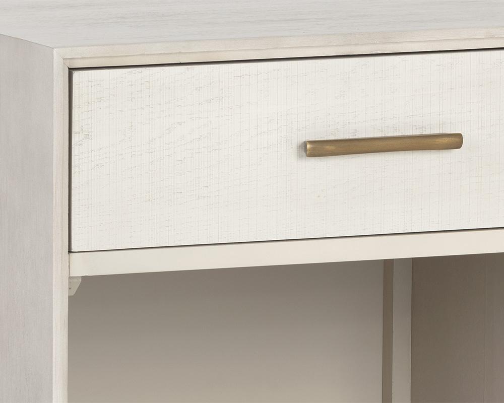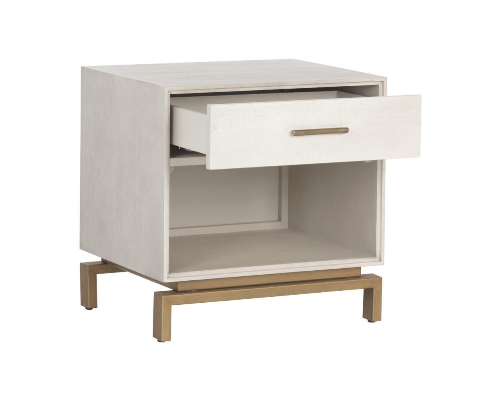 This sophisticated nightstand will bring a sense of luxury to any bedroom space. The modern frame is crafted with eucalyptus wood veneer and contrasting oak wood veneer drawer with a saw cut texture. Brass steel hardware completes the look. Coordinating dresser, chest, sideboard, display cabinet and bed also available.