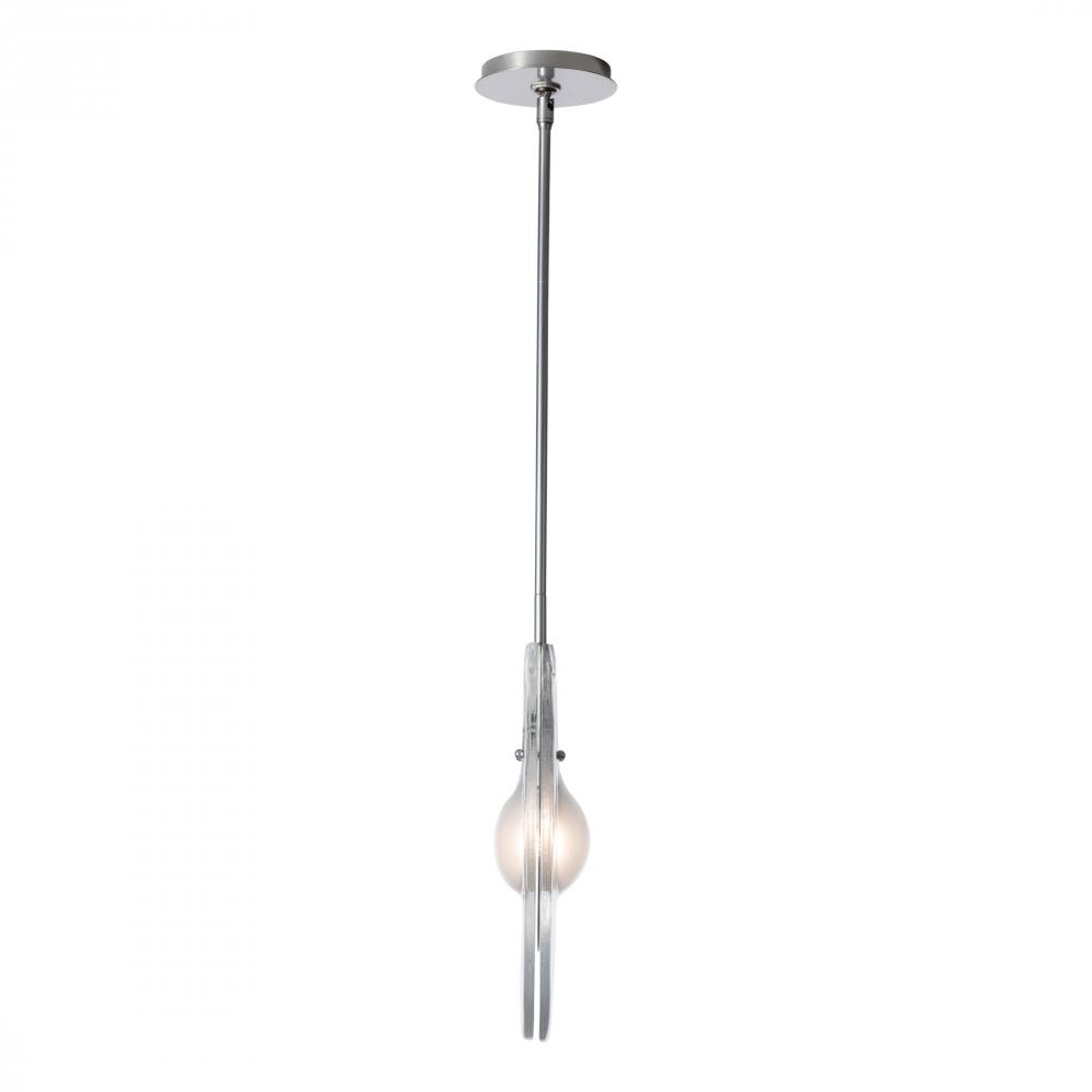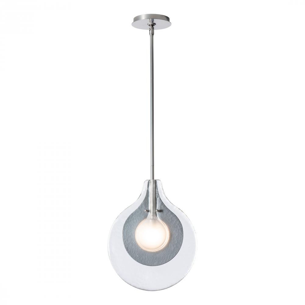 The use of Soiva glass from Venice was central to this design by HF's Jason Hancock. Two layers of handmade clear, textured glass encases a sculptural steel piece surrounding its bulb illumination. The frosted glass around the bulb gives a dimensionality to this single-light pendant. Part of the ART + ALCHEMY by Hubbardton Forge Collection.
