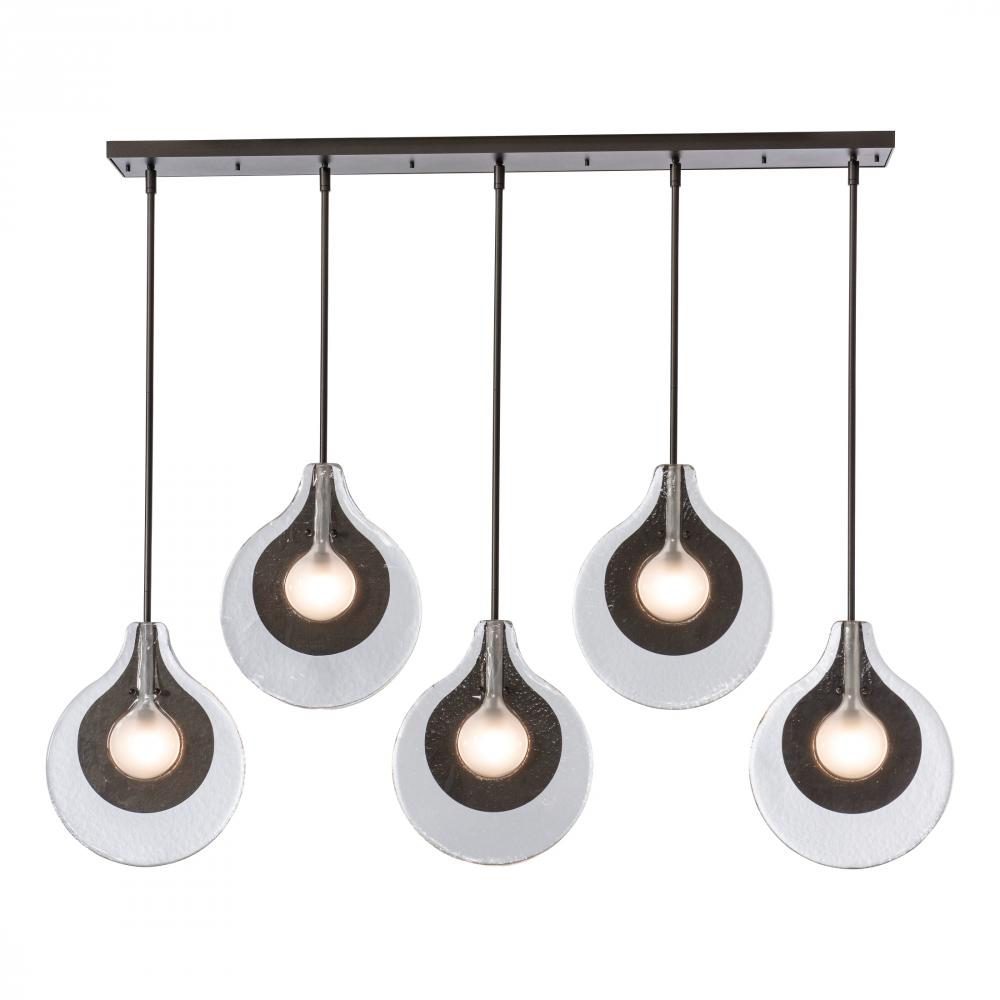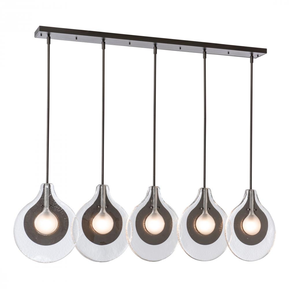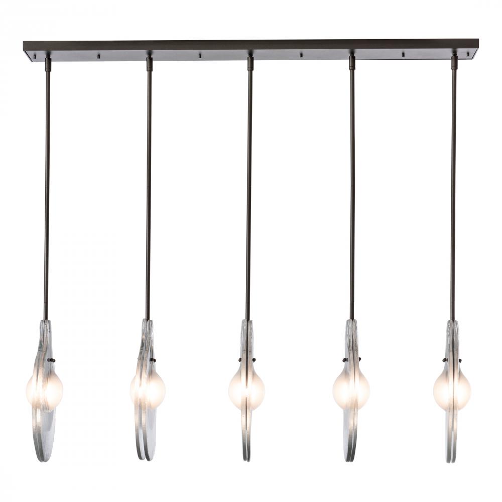 "Stunning." "Surprising." "Exquisite." We hear the new Veneto Collection described with excitement for its beautifully handcrafted Venetian glass. Look closely. The textured glass encases both the metal+bulb elements, with a central frosted glass in the bulb area. Part of the ART + ALCHEMY by Hubbardton Forge Collection, this linear Veneto pendant, by HF designer Jason Hancock, features five lights to dramatic effect.