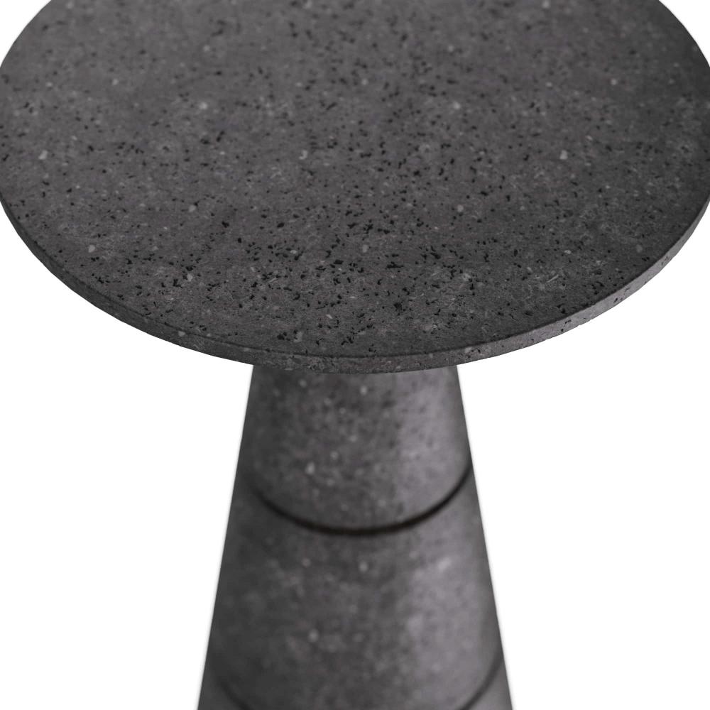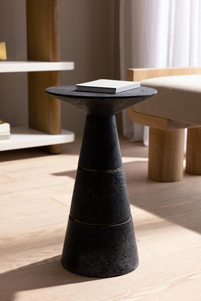 ALONGSIDE A LOUNGE CHAIR OR AS A PAIR FLANKING A SOFA, THE SHAPELY AND SOLID VERWALL ACCENT TABLE GROUNDS ANY SEATING ARRANGEMENT. THE TAPERED, CHARCOAL, GLASS STONE BASE IS DETAILED WITH AN INLAY OF ANTIQUE-BRASS STEEL, FOR A FRACTAL EFFECT. FINISH WILL VARY.