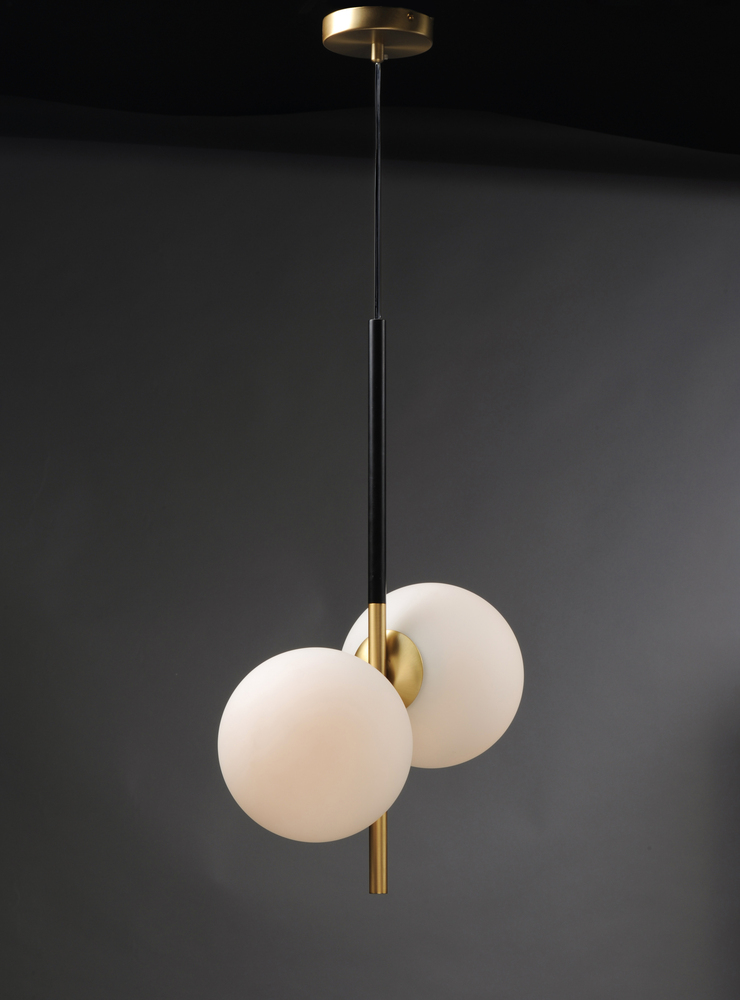 Inspired by both Mid Century Modern and Scandinavian Contemporary this collection spans a large breadth of today's interior design. Straight tubing finished in Satin Brass supports hand blown Satin White cased glass globes. Black accents of metal and B