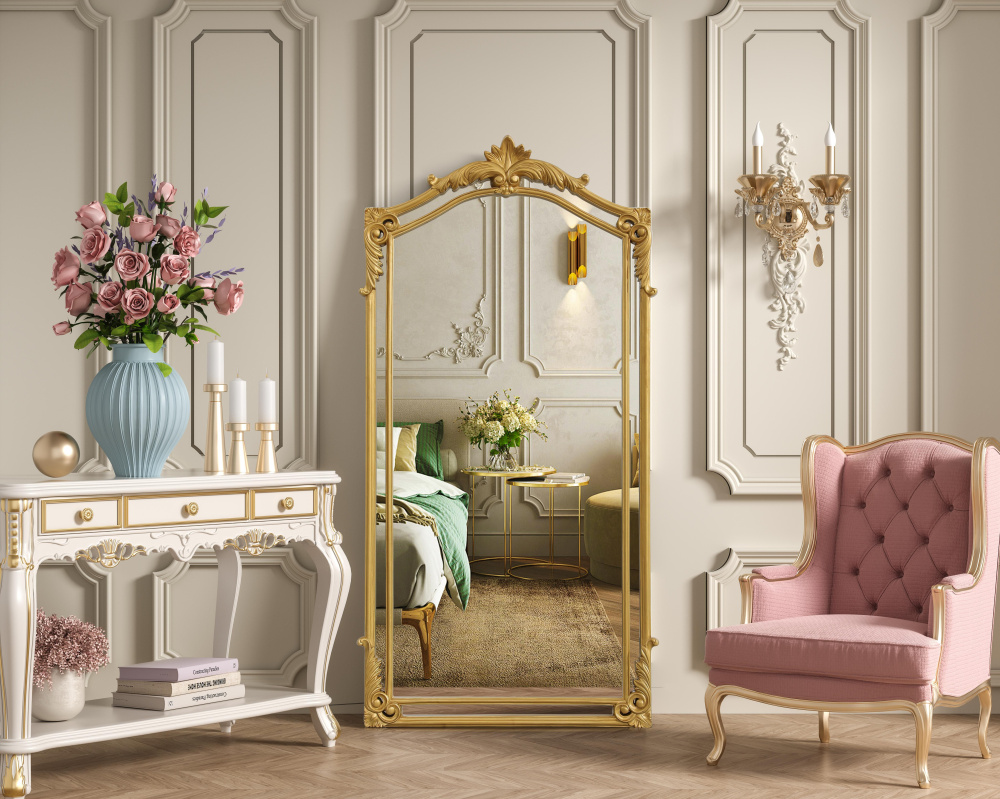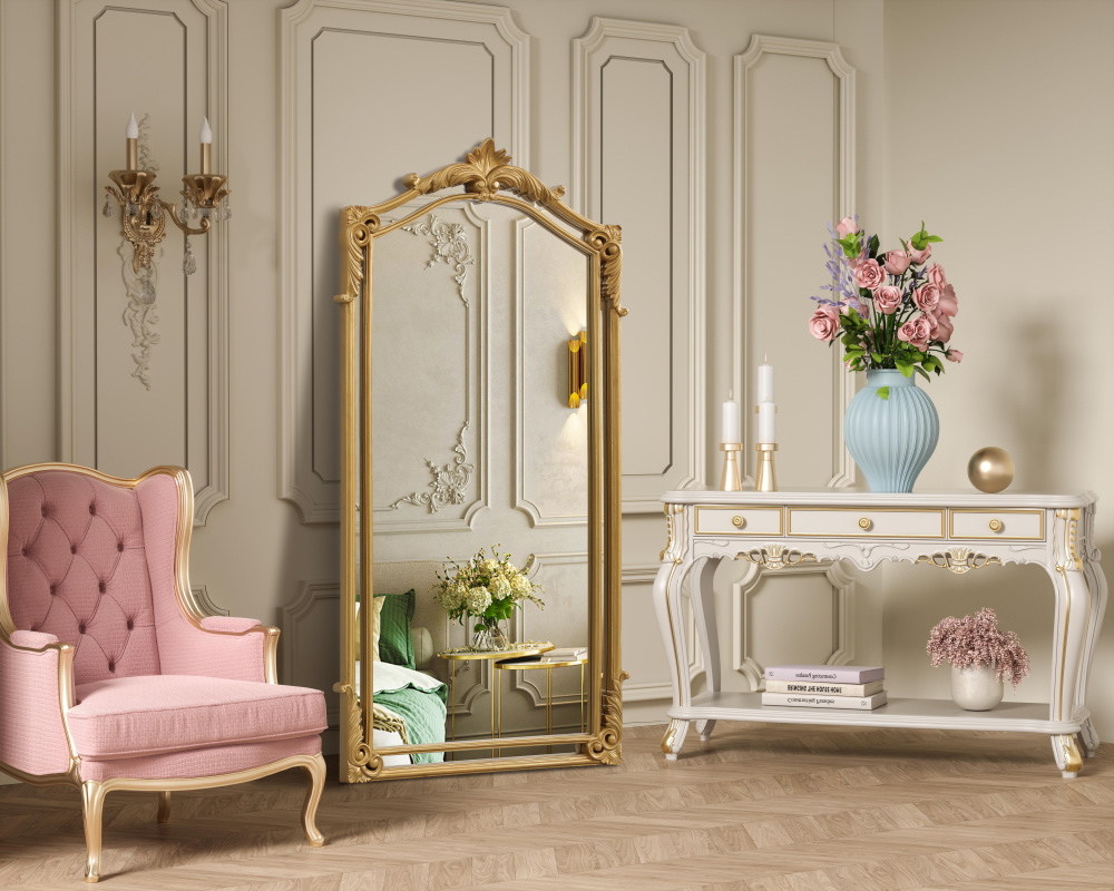 Whether placed in a living room, grand entryway, or above a vintage vanity, this mirror instantly enhances its surroundings with its regal presence.