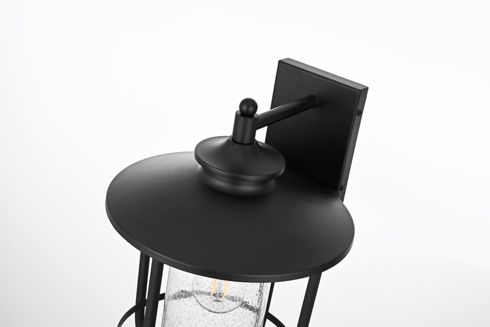This sconce features an iron frame with a matte black finish, giving it a sleek, modern-industrial look while retaining the warmth of a traditional farmhouse style.