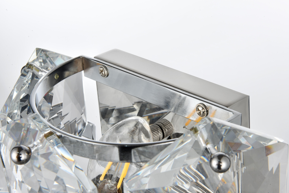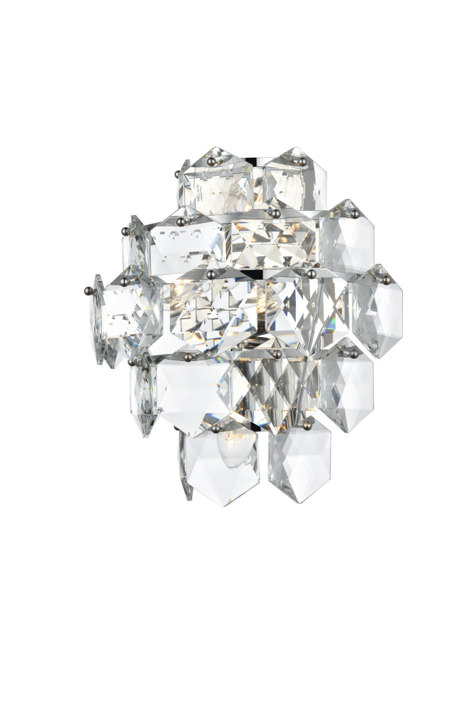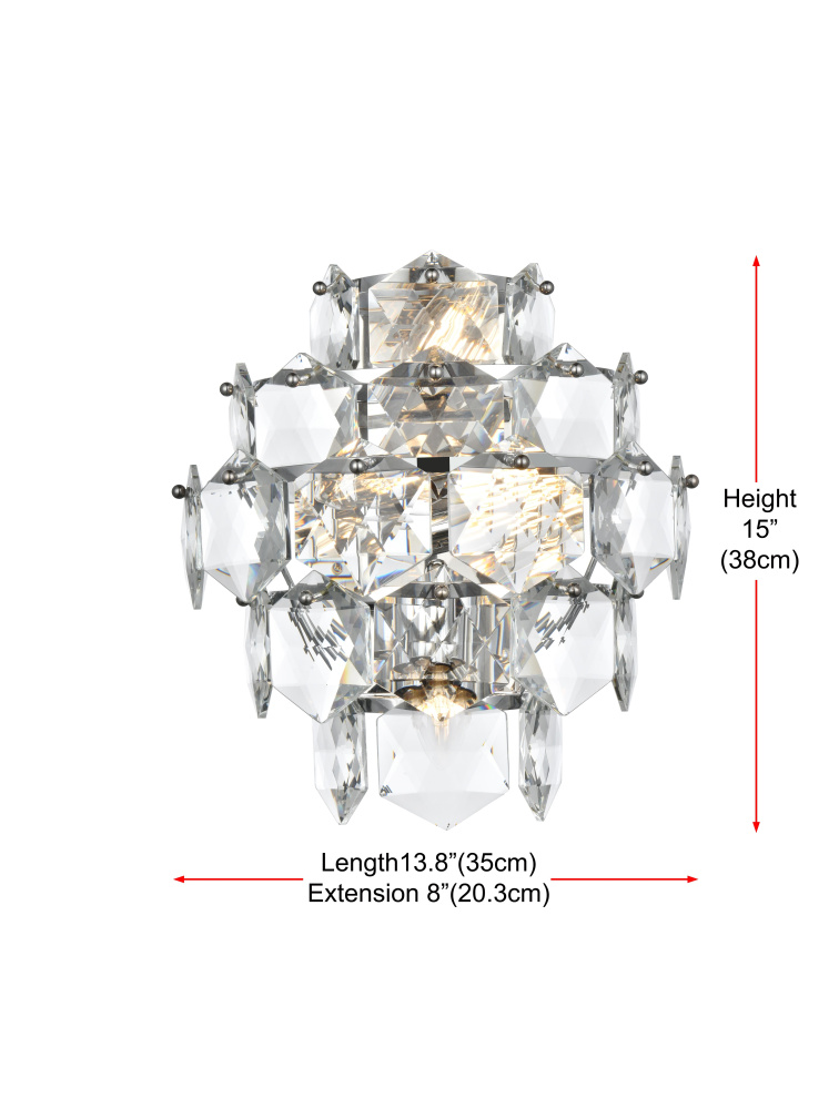 Add a touch of sophistication and shine to your space with this cascading crystal wall sconce light. Designed with a multi-tier arrangement of six-sided faceted crystals, this fixture creates a mesmerizing interplay of light and shadow, making it a standout addition to any room. Its sturdy iron frame is paired with your choice of a chrome finish for a sleek, modern aesthetic or satin gold for a warm, opulent feel. The fixture includes four E12 sockets (bulbs sold separately) and is fully dimmable, giving you the ability to set the perfect ambiance. The matching canopy finish completes the cohesive look. Compact yet visually impactful, this wall sconce is ideal for hallways, dining rooms, living rooms, bedrooms, or offices, offering both functional illumination and a dazzling decorative element.