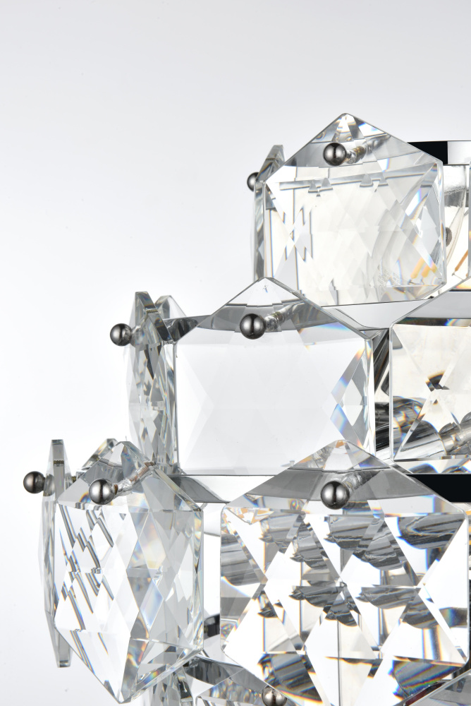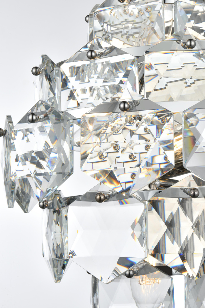 Oversized faceted crystal elements maximize light reflection and refraction.