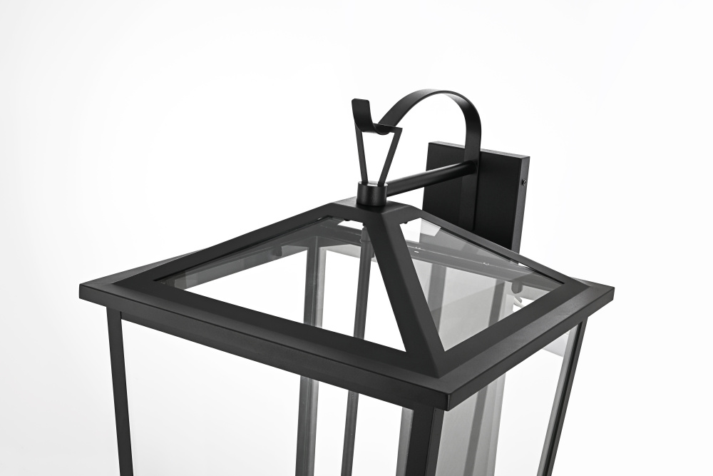 The outdoor wall sconce draws inspiration from a classic lantern silhouette. Its angular trapezoid structure creates a striking architectural element that blends old-world charm with modern flair.