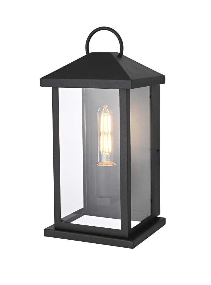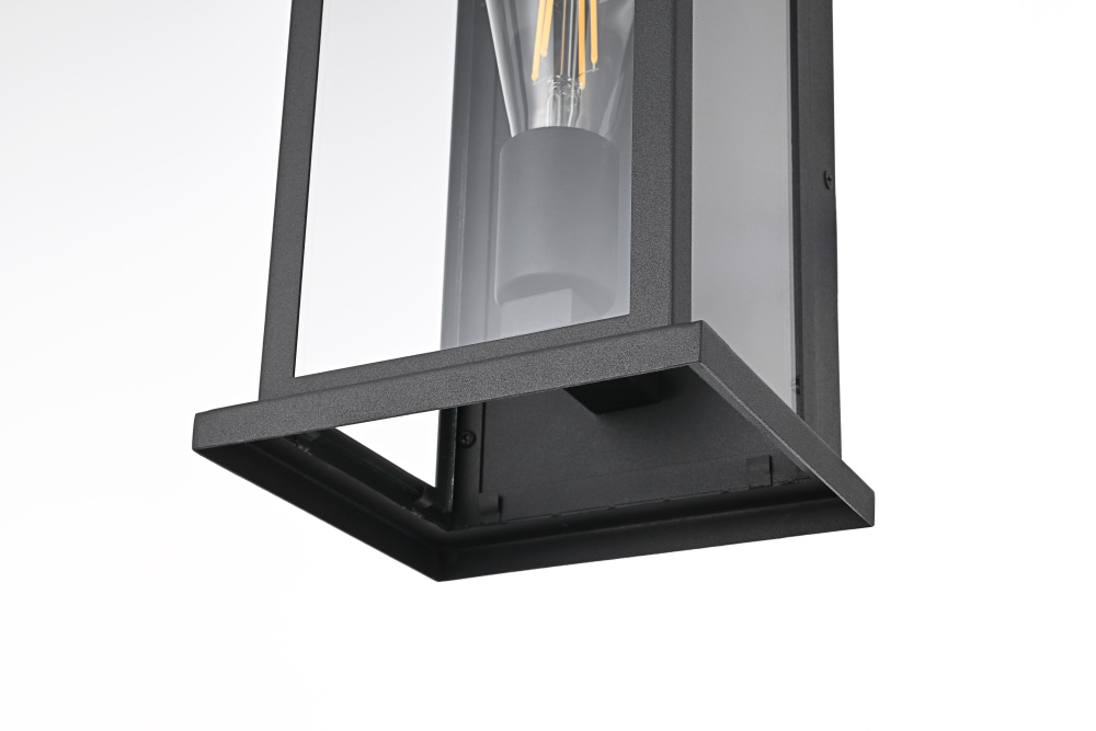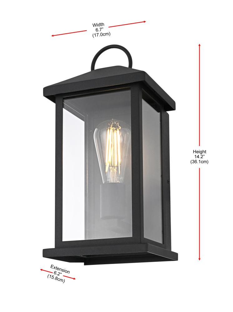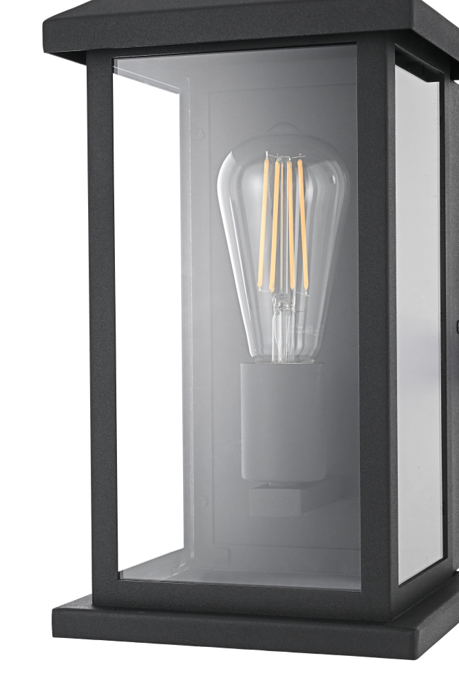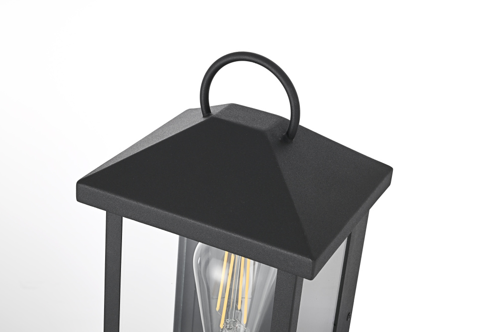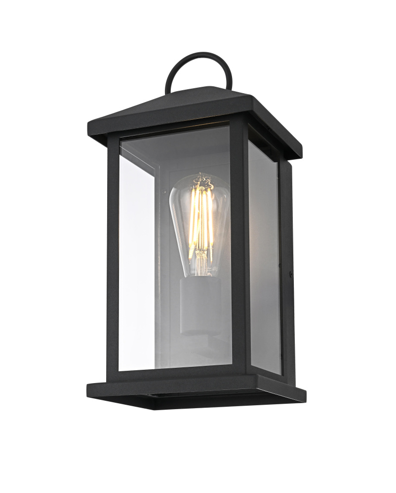 Enhance your outdoor space with the charm and functionality of this modern lantern-style wall light. A strong iron frame, finished in bold matte black, creates a timeless architectural presence, while clear glass panels allow the bulb’s warm glow to shine through unobstructed. A decorative ring detail at the top adds a subtle nod to classic lantern designs, blending tradition with modern refinement. The open-bottom design ensures easy bulb changes and effortless maintenance, making it as practical as it is stylish. Designed with an E26 socket (bulb not included), this light allows for complete customization in brightness and style. Wet rated for durability, it’s the perfect lighting solution for front porches, patios, and outdoor walkways, offering a radiant, welcoming ambiance year-ro