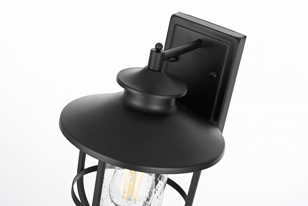 This sconce features an iron frame with a matte black finish, giving it a sleek, modern-industrial look while retaining the warmth of a traditional farmhouse style.