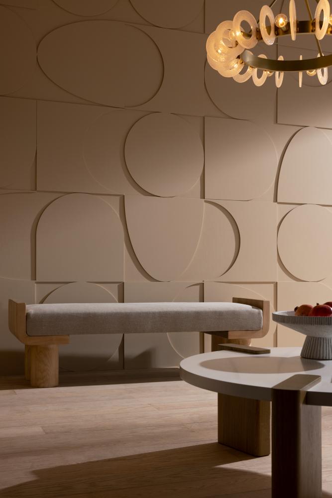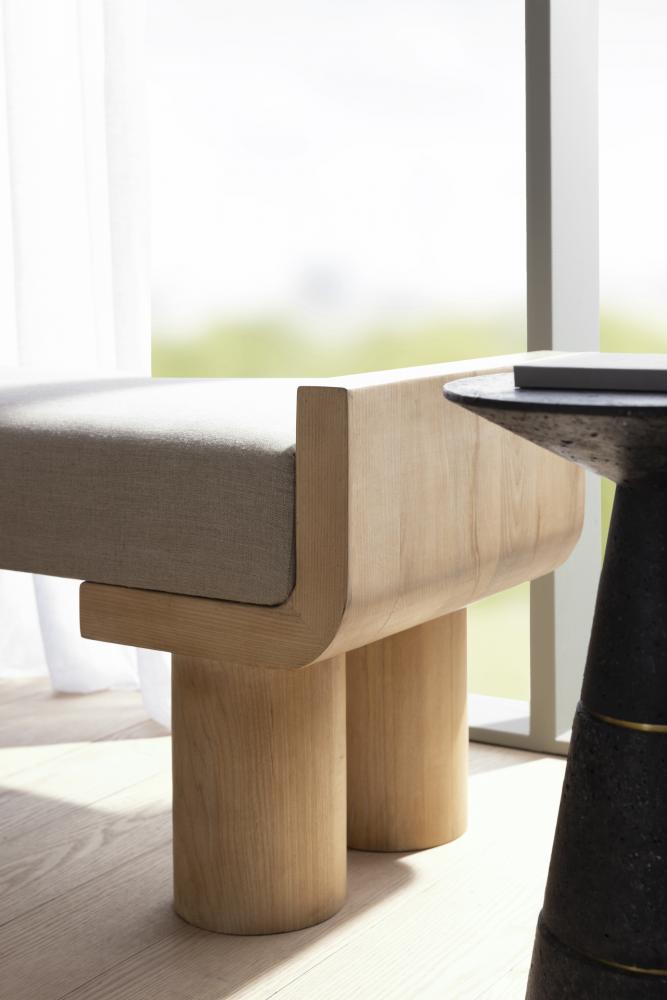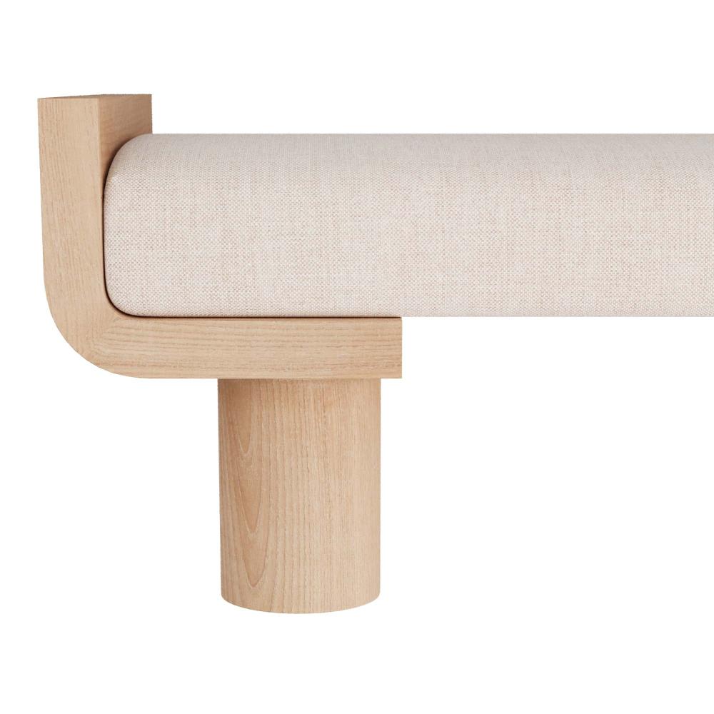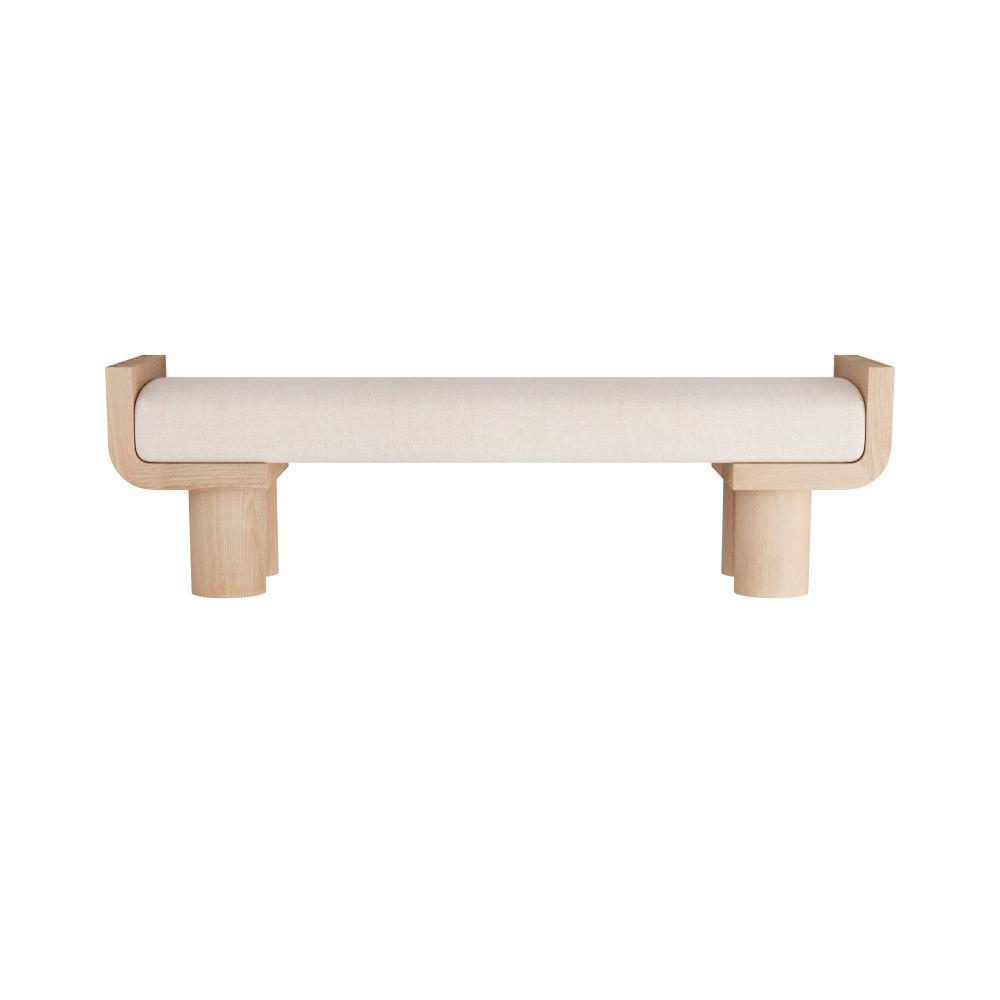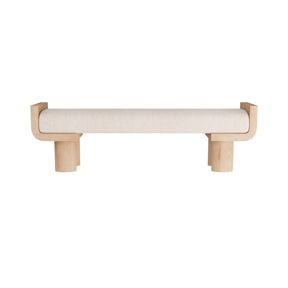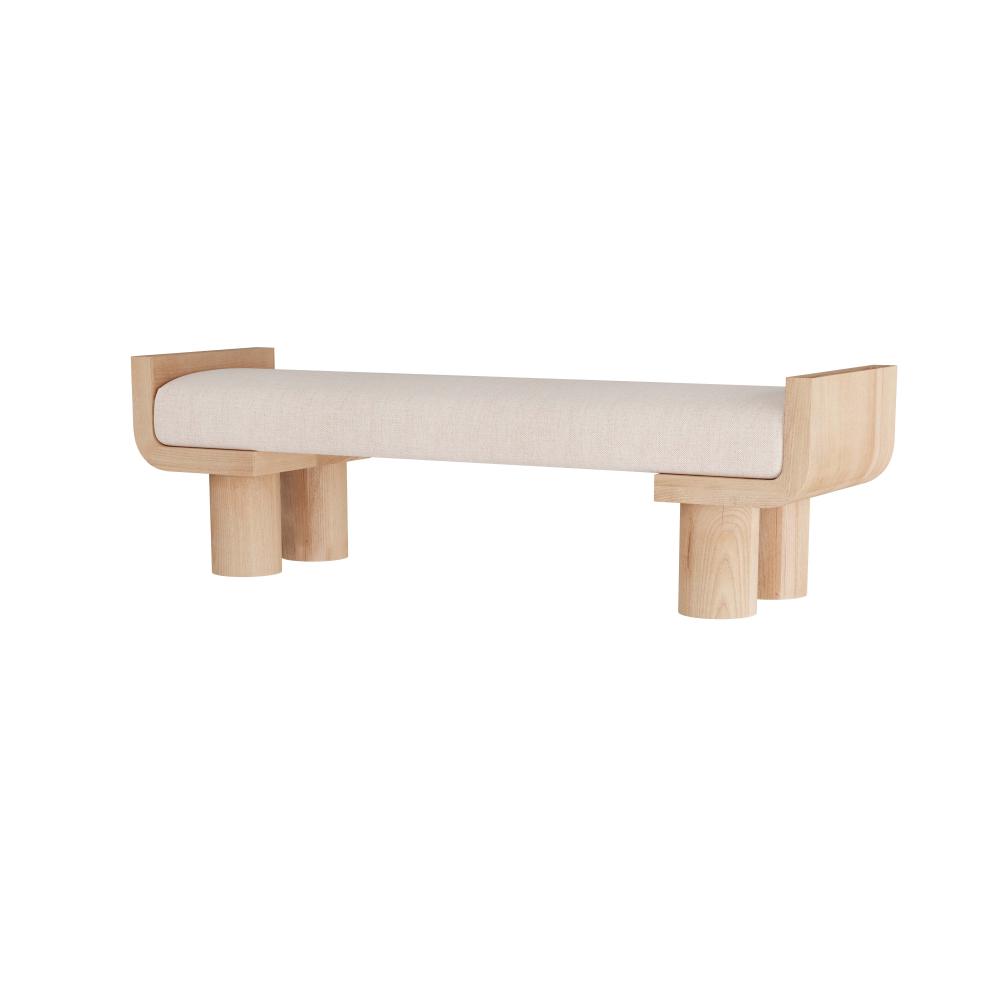 CREATIVITY AND MINIMALISM INFORM THE DESIGN OF OUR WESLEY BENCH. THE PIECE IS CRAFTED IN BLONDE OAK, WITH FOUR CYLINDER LEGS THAT INTERSECT WITH CURVED ARMS THAT FORM A FRAME FOR AN UPHOLSTERED, NATURAL LINEN CUSHION. THE STRONG, SEGMENTED SHAPES CALL ATTENTION TO ITS BLOCKED, ARCHITECTURAL CONSTRUCTION, WHILE GIVING THE ILLUSION THAT THE CUSHION IS FLOATING. FINISH WILL VARY.