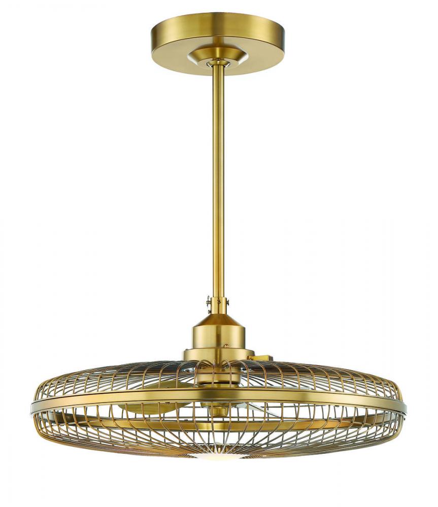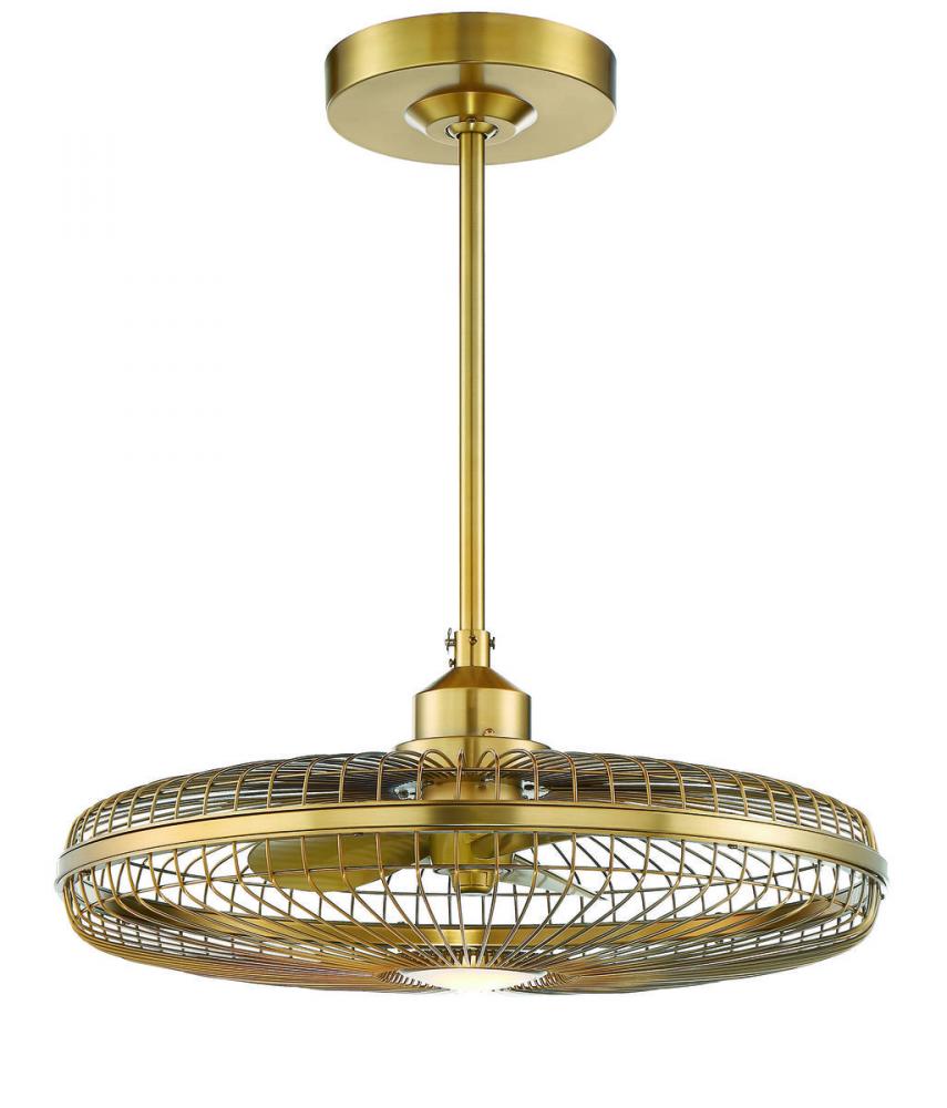 The Savoy House Wetherby Fan D'Lier has a stylish, vintage look thanks to its classic cage frame. It features an inner ceiling fan and an integrated light for illumination and comfort. The 26" wide fixture has a terrific warm brass finish with gold fan blades and a white etched glass shade that covers the included 12W dimmable LED bulb. A handheld remote, with three-speed fan control and independent light control for easy light and airflow adjustments, is also included. This Fan D'Lier is rated for damp locations, so it may be installed indoors as well as in covered outdoor areas.