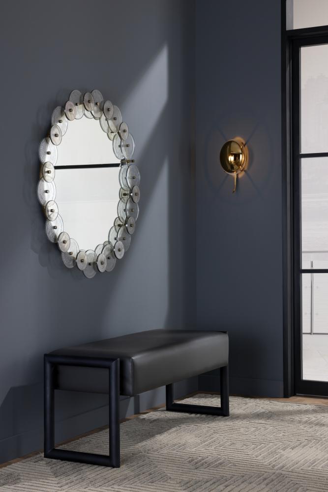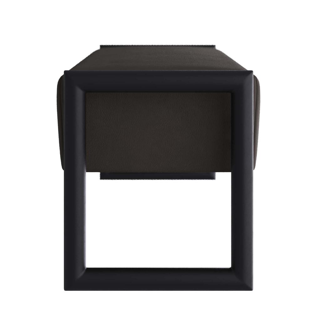CONCEIVED IN A HANDSOME MIX OF SMOKY GRAPHITE LEATHER AND CONTRASTING BLACKENED BRONZE IRON, OUR WILCOX BENCH IS A MOODY AND MODERN ADDITION TO ANY SPACE. THE PIECE IS ELEGANTLY CONSTRUCTED WITH A CANTILEVERED SEAT CUSHION, GIVING THE ILLUSION THAT THE SEAT IS FLOATING BETWEEN ITS THICK RECTANGULAR CONSTRUCTION. FINISH WILL VARY.