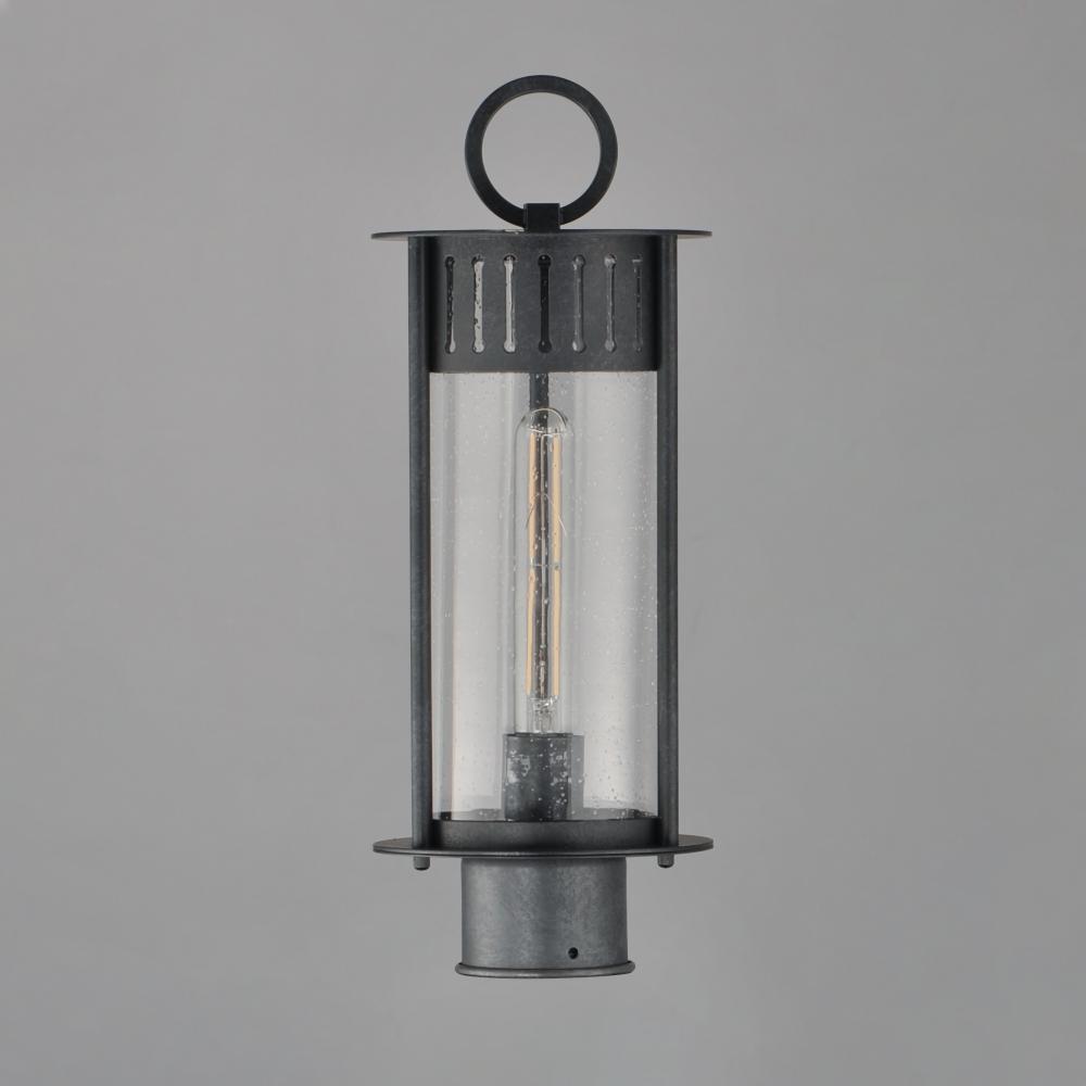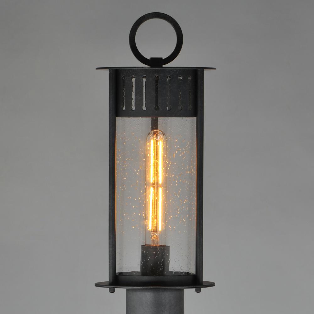 Inspired by the rounded towers of Windsor Castle, this outdoor lighting collection features a hand-applied Black Patina finish on Stainless Steel. A slotted filigree along the top of the cylinder frame allows light to escape, while the clear seeded glass o