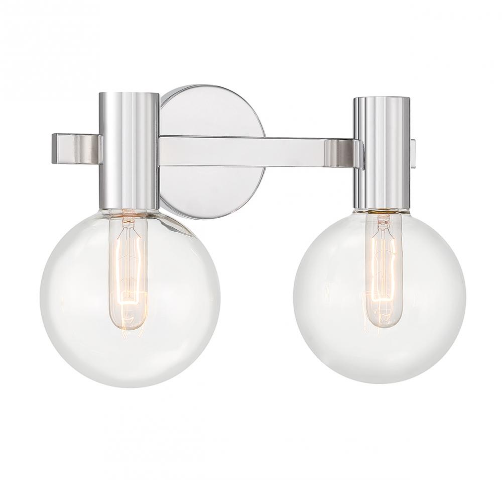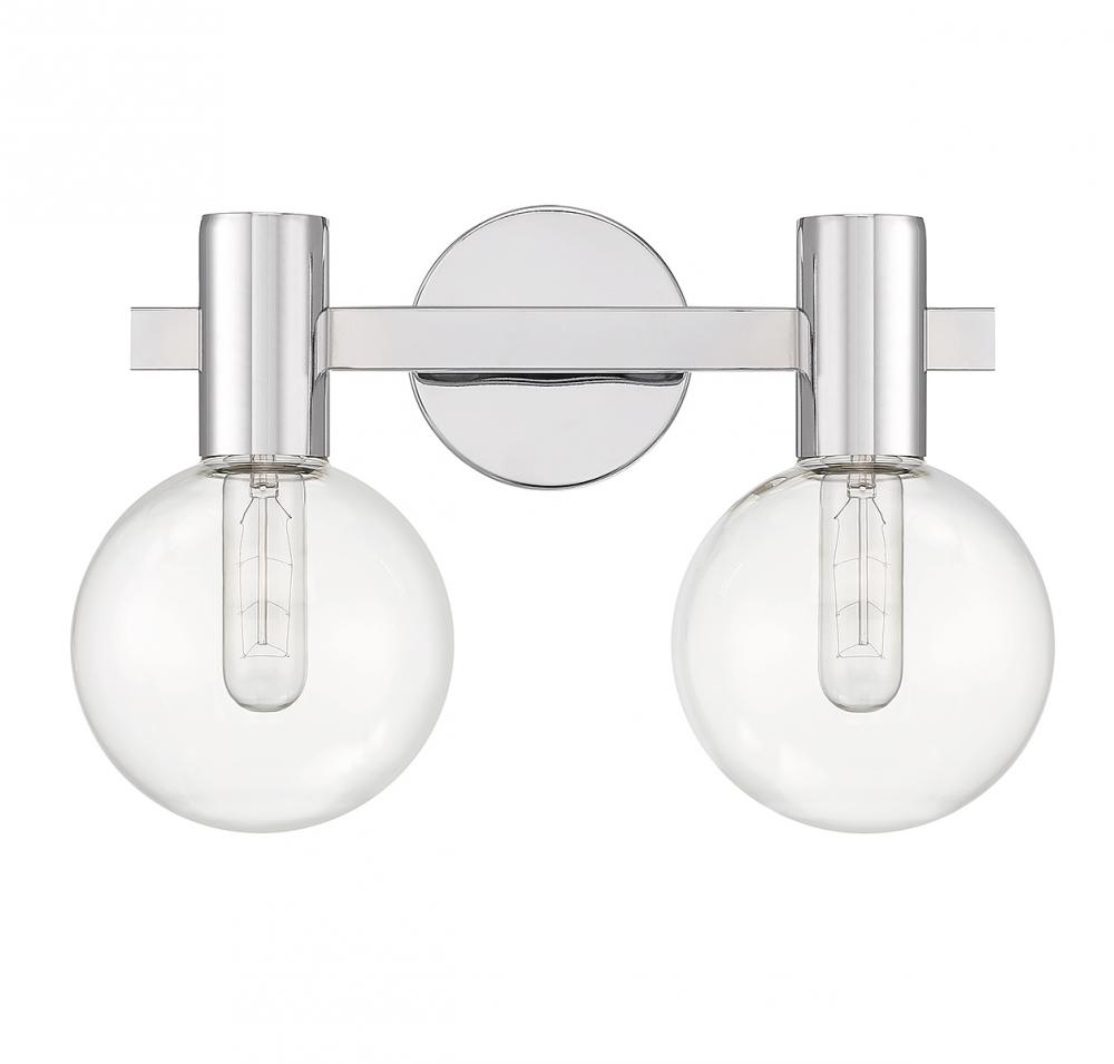 This Savoy House Wright 2-light bath vanity light showcases streamlined style that makes it ideal for any bathroom. Round clear glass shades add an extra dimension and extra protection for the light bulbs within. Chrome finish. Wright is 15.5" in width, 10" in height and extends 7.5" from the wall. Uses 2 standard size bulbs of up to 60 watts per bulb (bulbs not included). We recommend using tubular shaped bulbs.